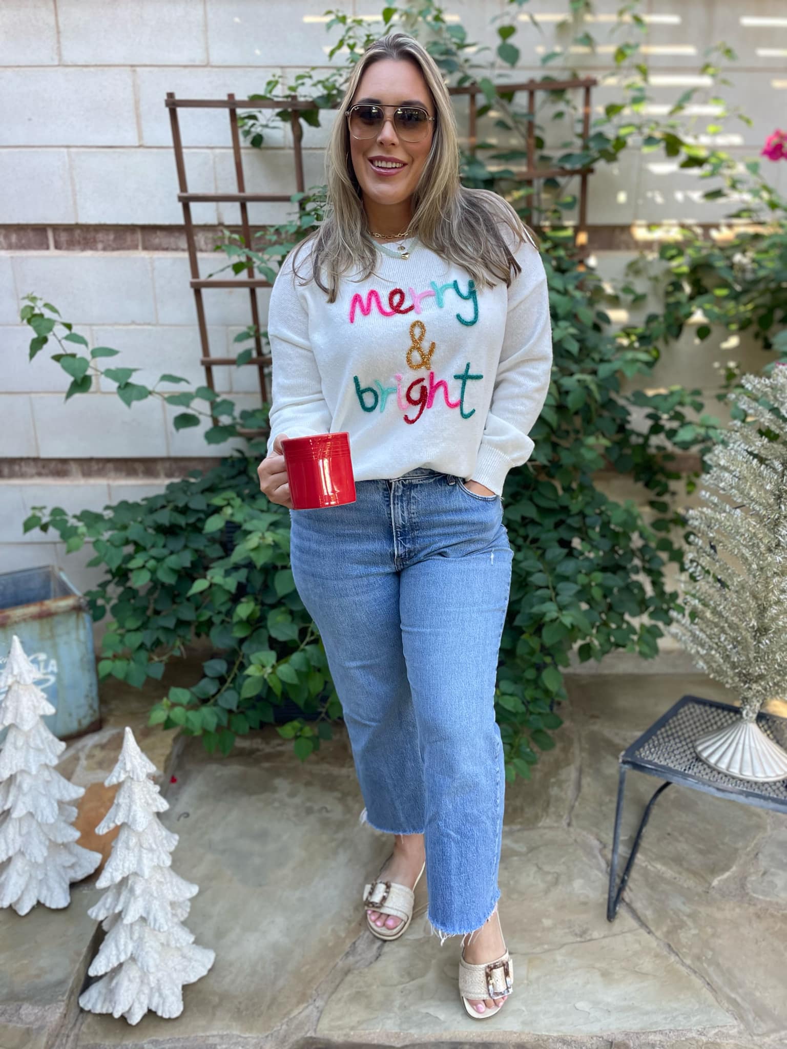 Get ready for the merriest Christmas with this festive tinsel sweater! True to size with a round neckline, cream knit background and multicolor tinsel detailing. Soft with stretch!