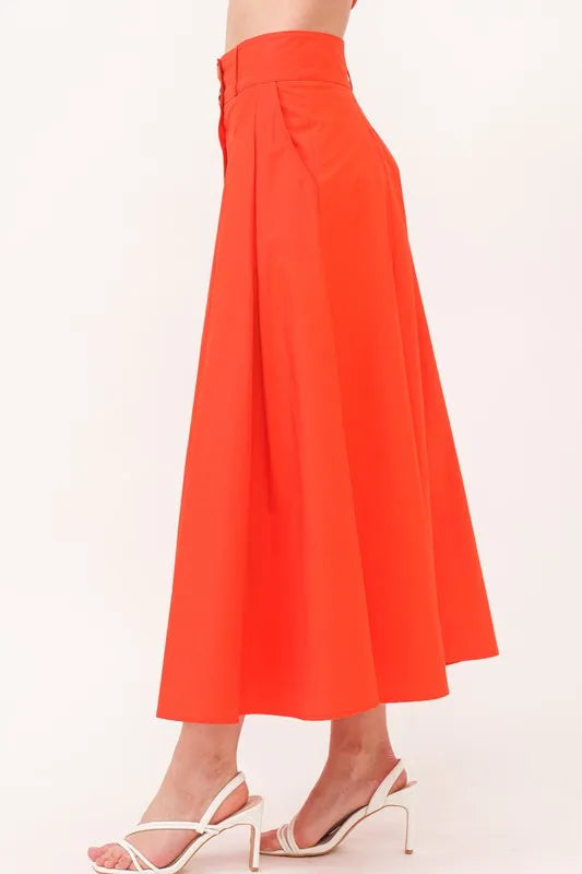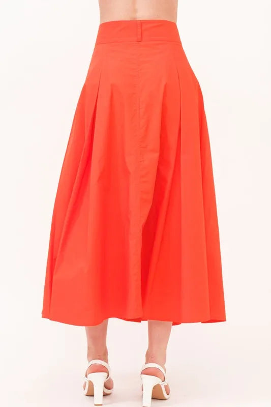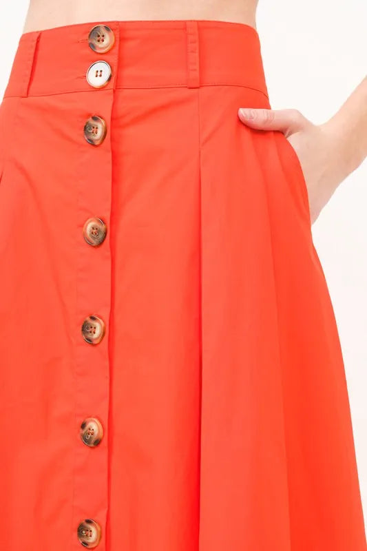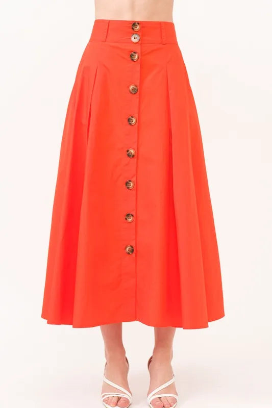 The Button Front Pleated Midi Skirt is a stylish and versatile piece with a button-down front detail. The pleats add a feminine and elegant touch to the skirt. Pair it with a blouse and heels for a chic outfit option.