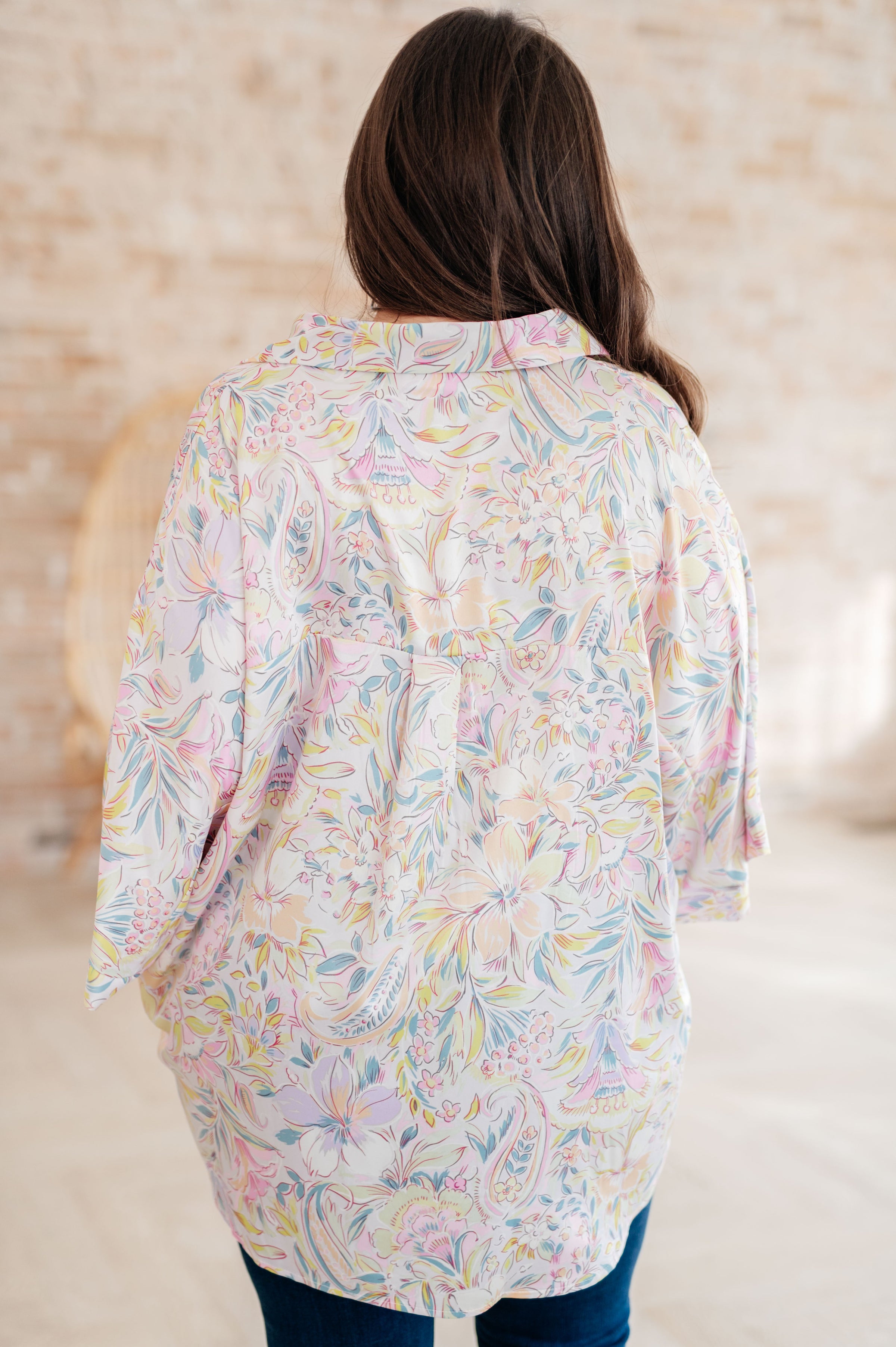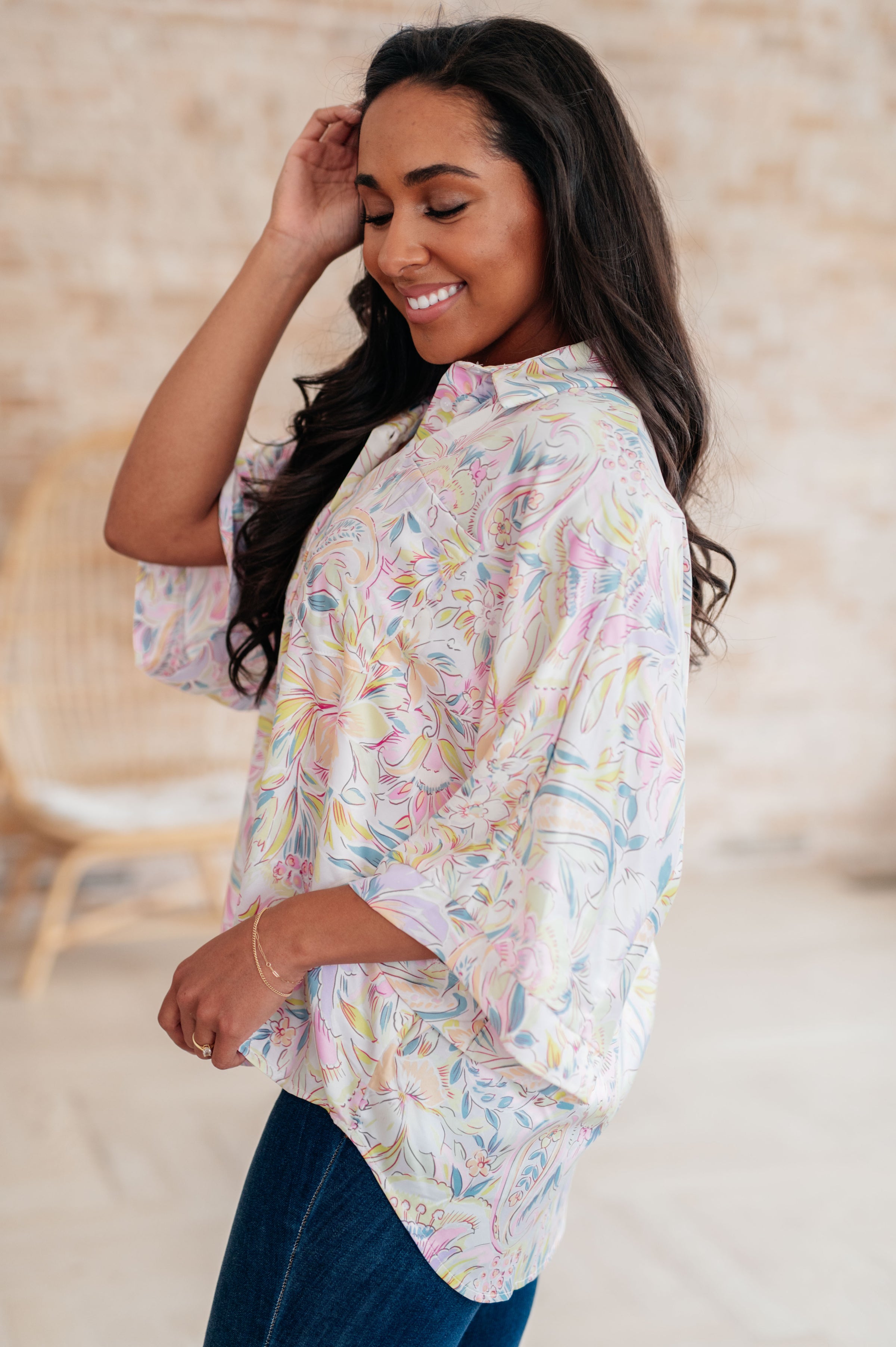 Unleash your inner flower child with our Blissful Botanicals Blouse! Made with lush Poly Satin, this blouse features a collared neckline, half front button closure, and playful batwing sleeves. Complete with a patch pocket, banded sleeve cuffs, and a high-low scooped hem. Go ahead, embrace your bohemian side!
