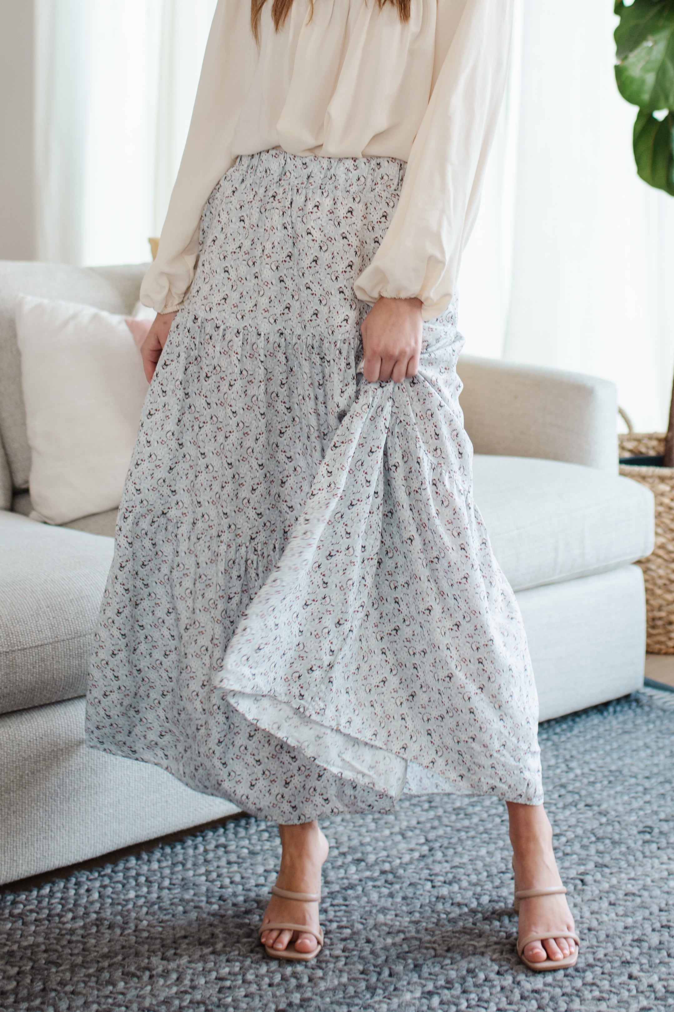 Throw on the Easy Breezy Skirt and instantly look put together! Dainty Blue and white flowers sweep across the entire skirt, in a tiered maxi silhouette with an elastic waistband. You'll be feeling comfortable and stylish in a breeze! Pair with your favorite sandals and tank for an adorable spring look!