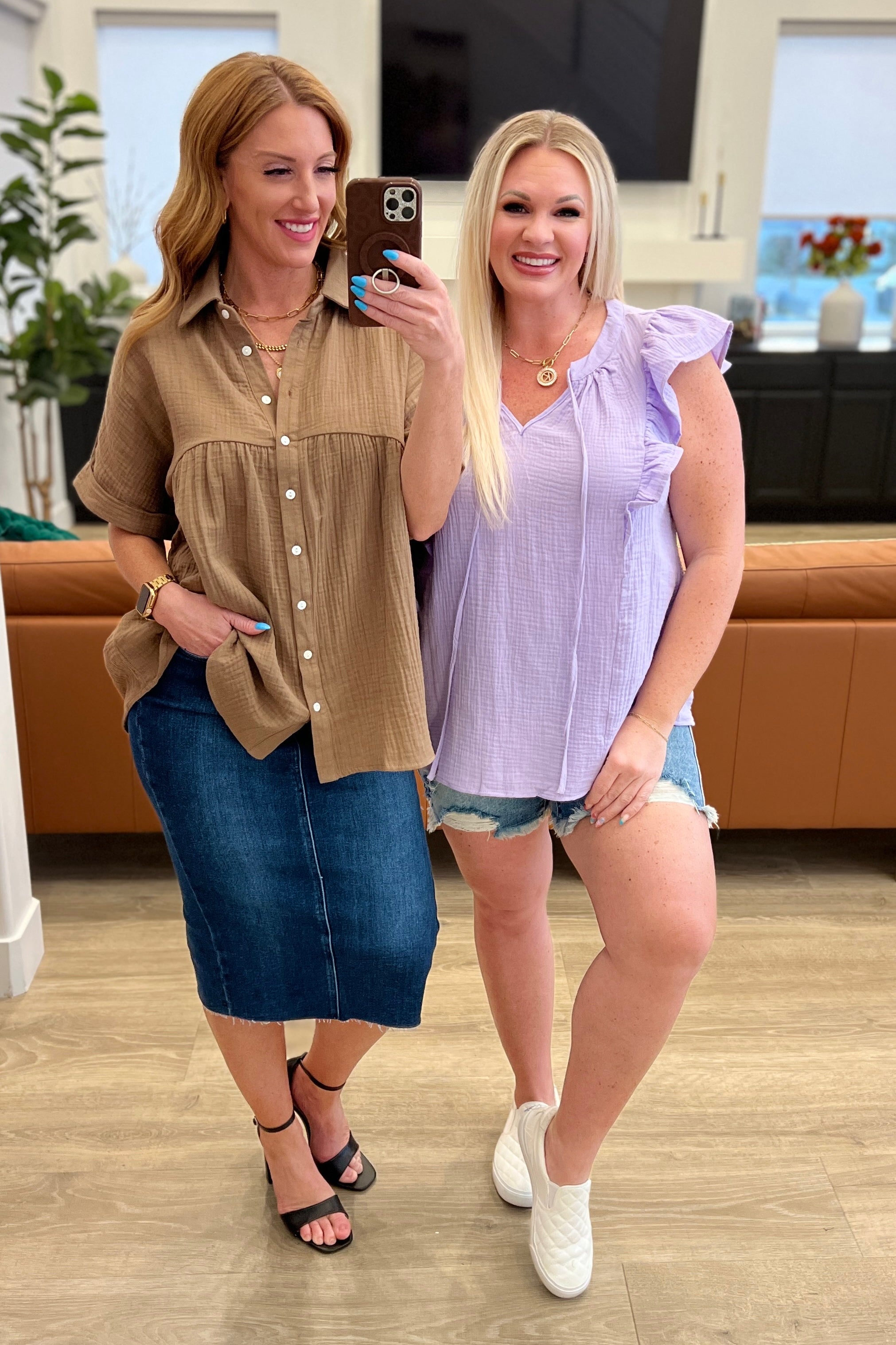 Gauze Button Down Babydoll Blouse in Mocha