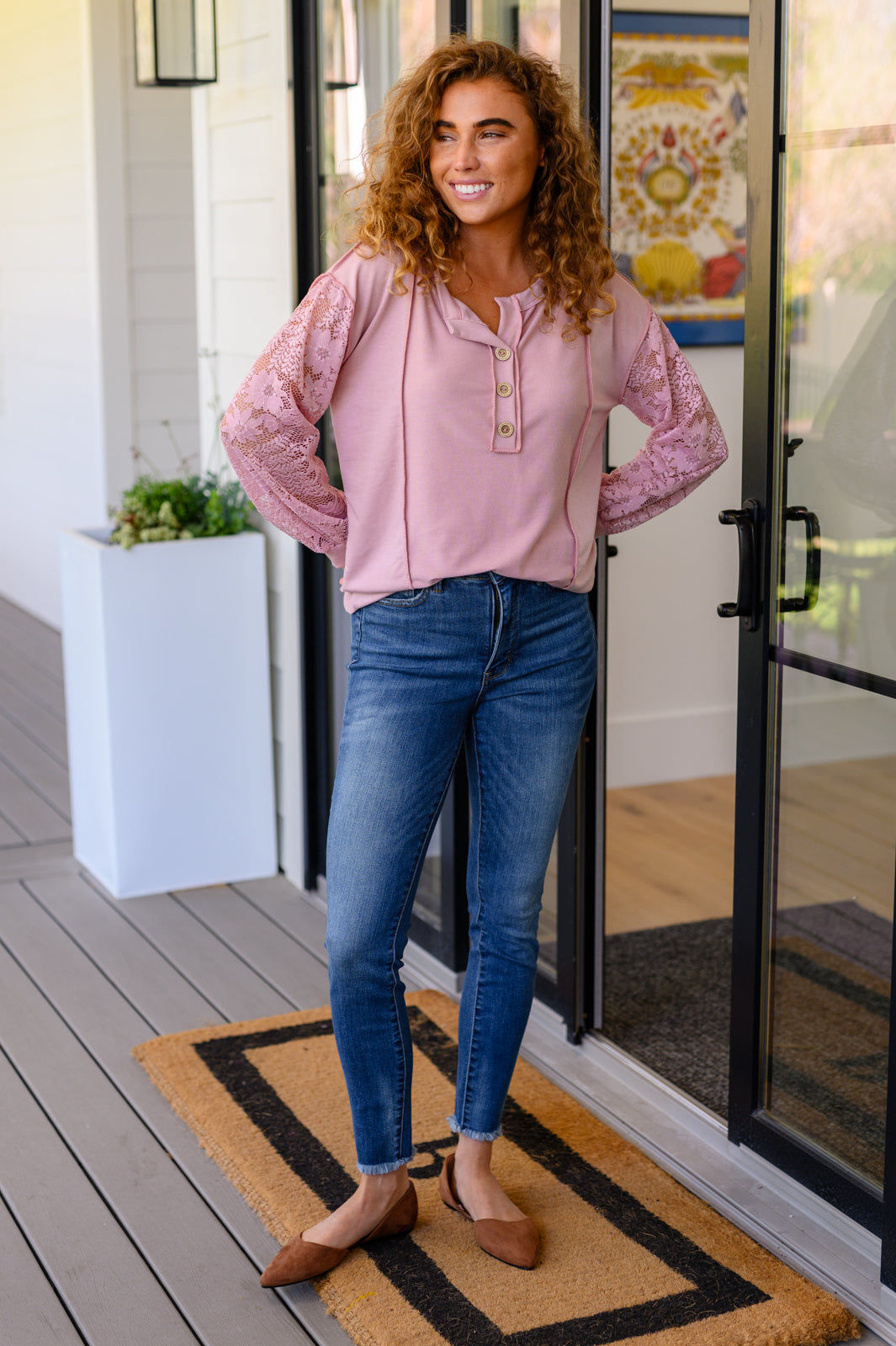 Show off your one-of-a-kind style with this Last But Not Least Lace Sleeve top. Featuring exquisite lace sleeves, on a henley style with wood buttons, it's crafted from contrast french terry with exposed seams for a unique look. It's perfect for making an eye-catching yet elegant statement!
