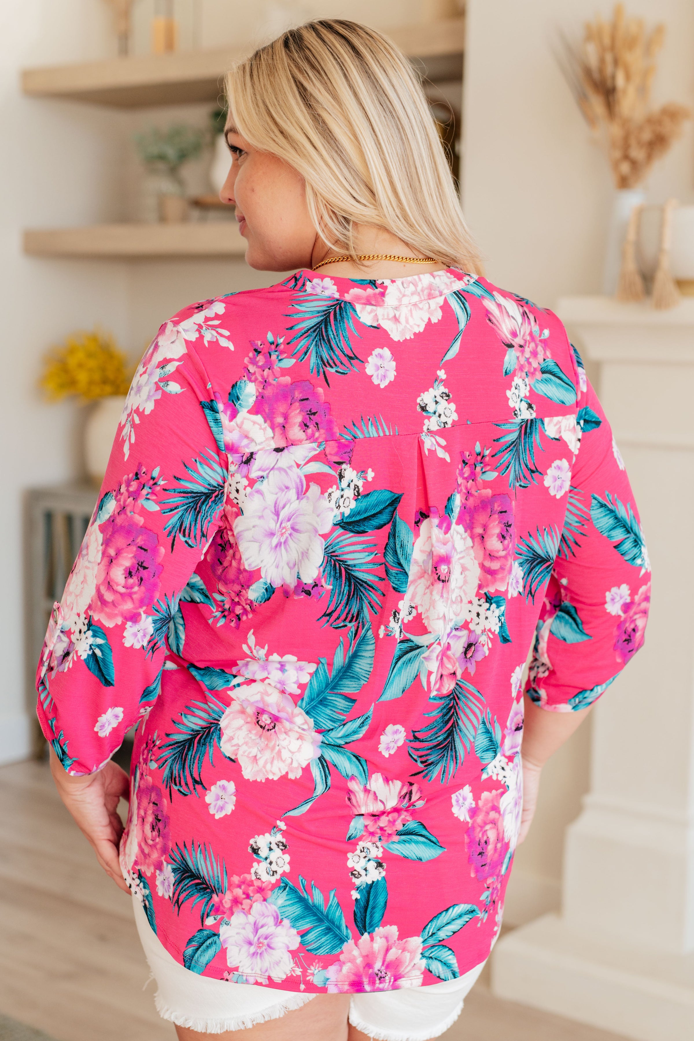 Transform your closet with the Lizzy Top in Magenta and Teal Tropical Floral. Made from Bulgari, this top features a gabby neckline and button rolled sleeve tabs for a comfortable, yet eye-turning piece. The 3/4 sleeve and scoop hem add flow to the already stylish piece. Experience comfort and style in one with the Lizzy Top.