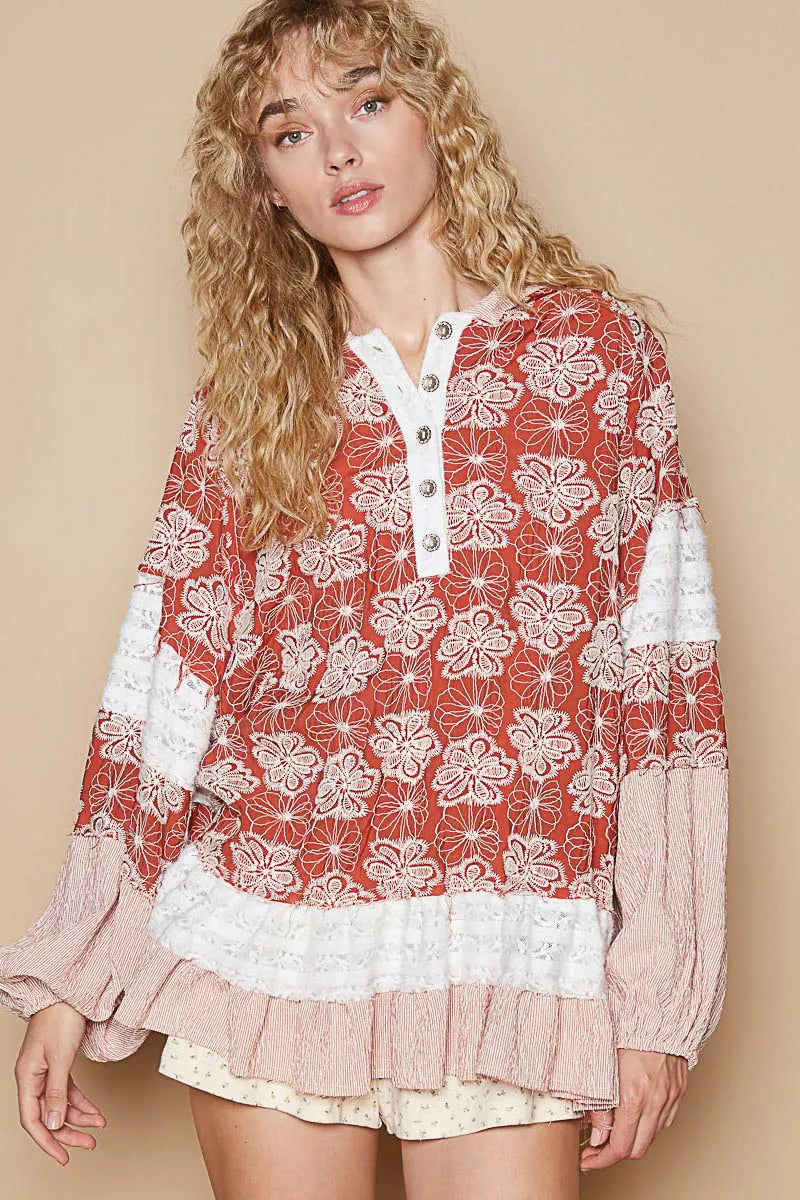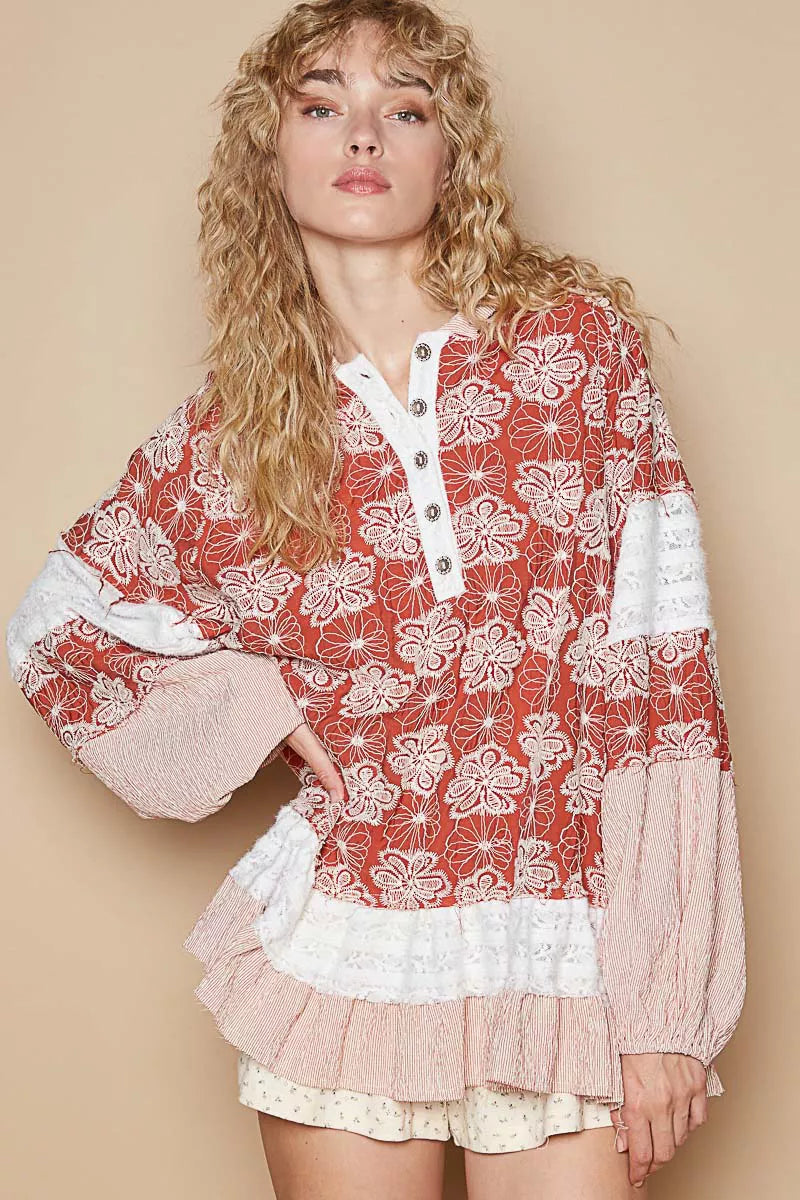 This bohemian-style oversized top features a stunning vintage-inspired floral print in warm terracotta and white tones. Crafted from lightweight, flowing fabric that drapes beautifully, this top offers ultimate comfort with its relaxed fit. The design showcases contrast color blocking on the sleeves, creating a unique layered look. Perfect for casual outings, beach vacations, or festival wear, this versatile piece can be styled alone or layered over tank tops. The soft, breathable material ensures all-day comfort while the oversized cut provides a flattering silhouette for all body types.