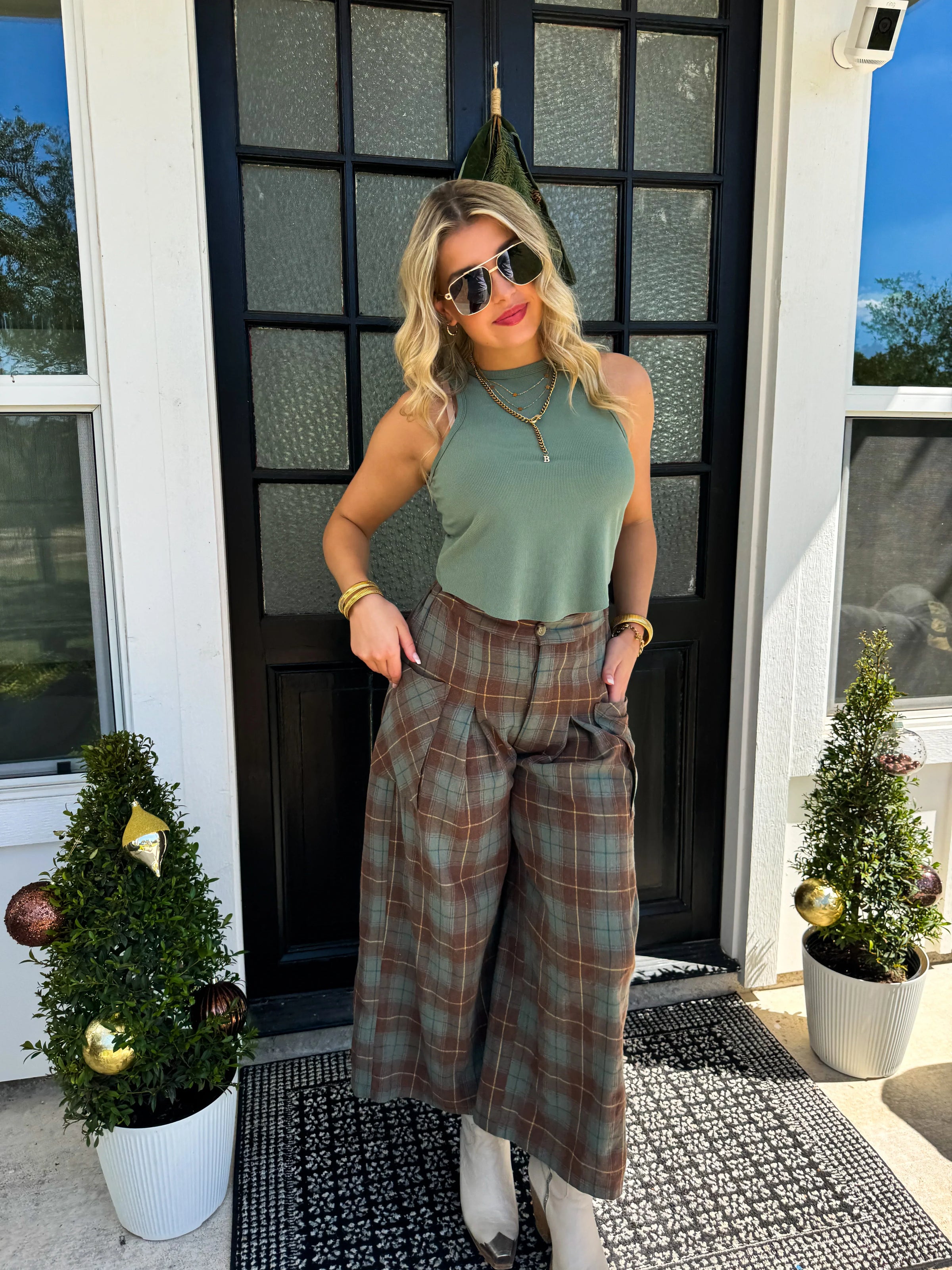 Introducing the cutest pants bound to receive endless compliments! Available in navy and green, these crop palazzo style plaids feature stunning panel stitch details with front pleating that is truly everything. Features front buttons and a stretchy elastic waist back. The fit is perfection!  Wide flowy legs with a high rise fit.