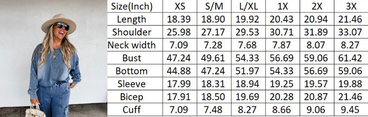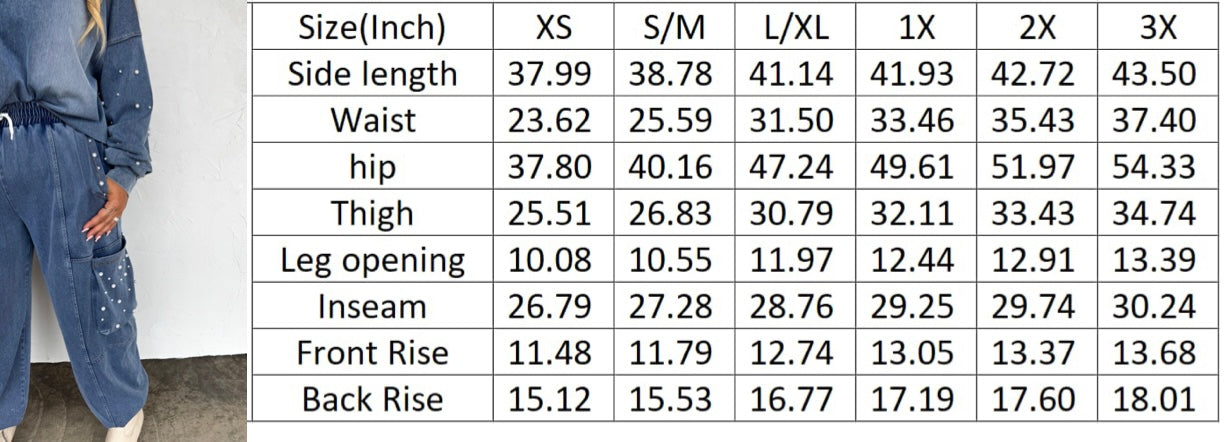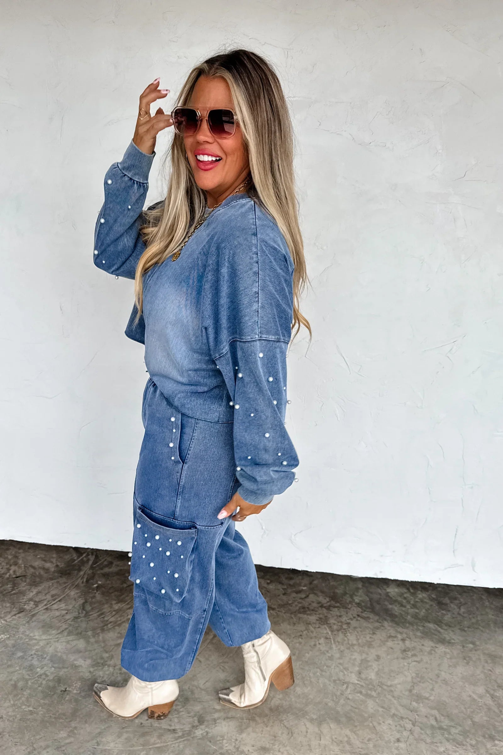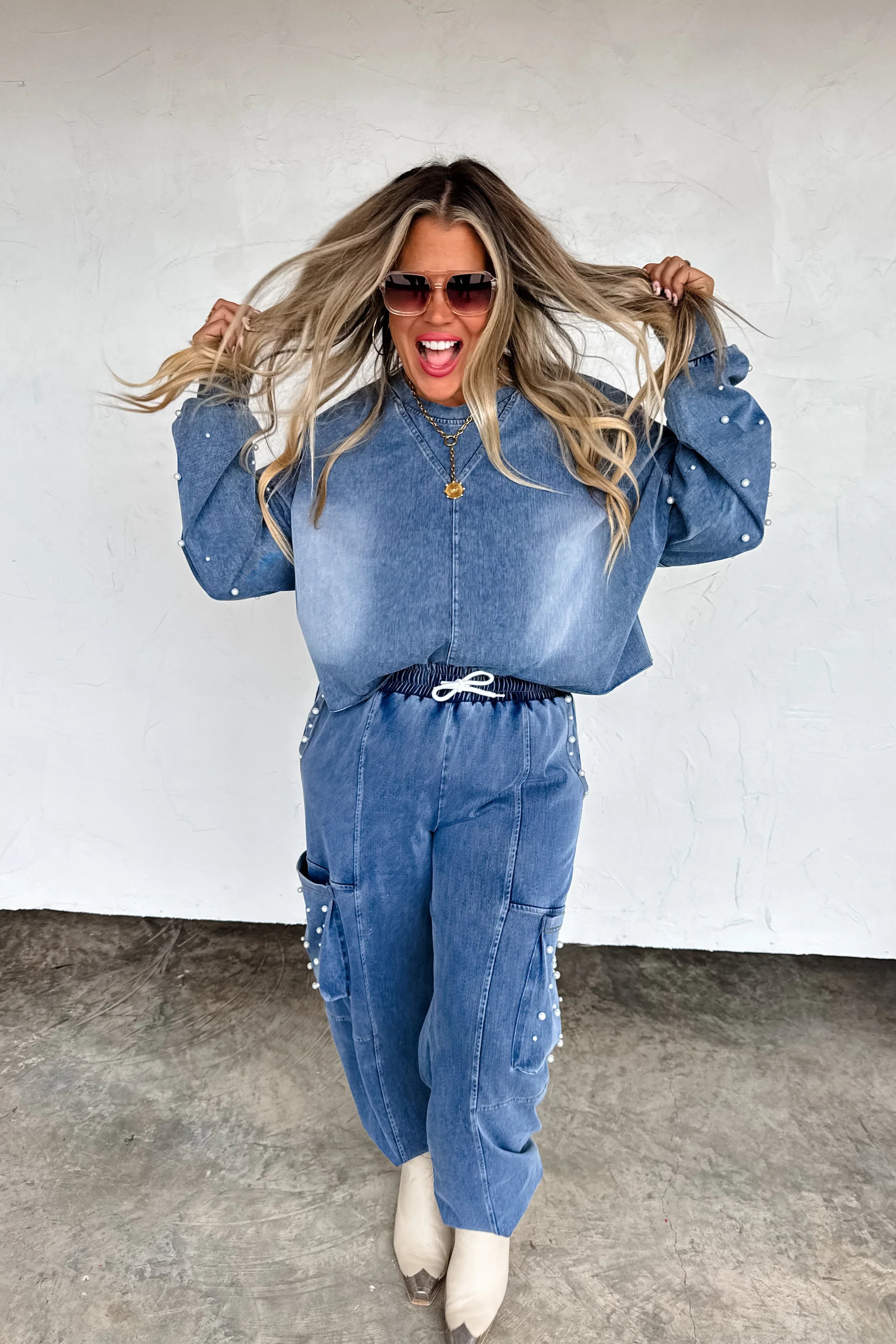 This STRETCHY denim set features a relaxed semi cropped top and matching jogger pants, both detailed with pearl embellishments for a chic, standout look. The top has long sleeves with pearls along the arms and a slightly boxy fit, while the pants include oversized cargo pockets trimmed with pearls for added style. Designed with an elastic waistband and adjustable tie, the pants offer comfort and versatility. Made from a fabulous washed, stretchy denim fabric, this set combines casual ease with elevated detailing, making it a statement look that can be worn together or separately.