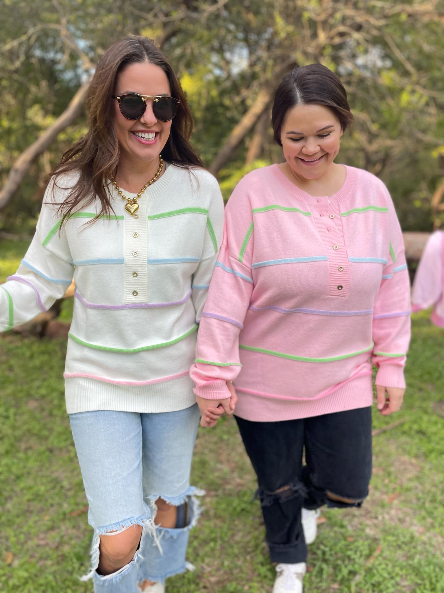 This adorable henley style sweater features a pastel stripe design with functional buttons. A midweight sweater knit with drop shoulders and a relaxed fit. Available in two colors!