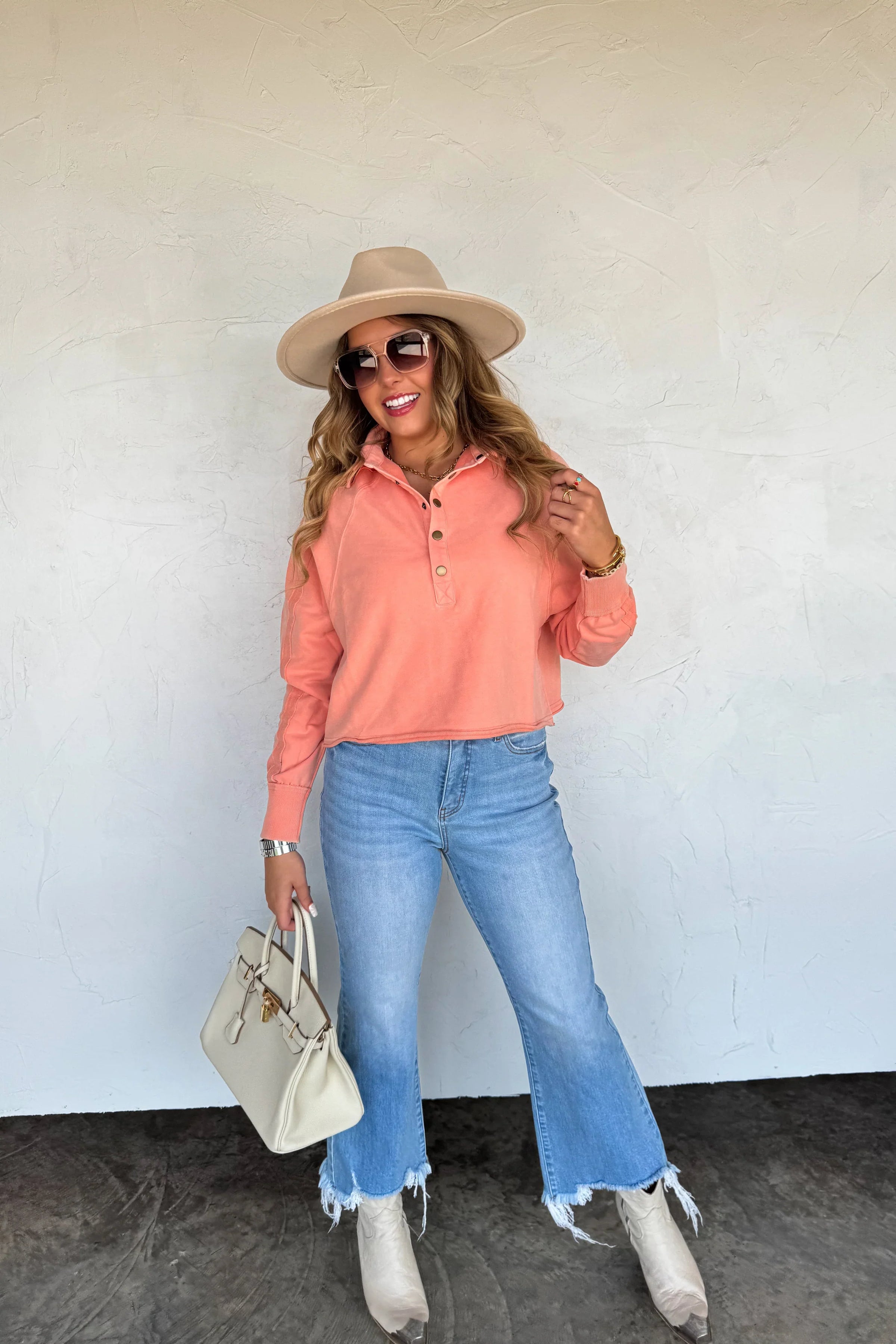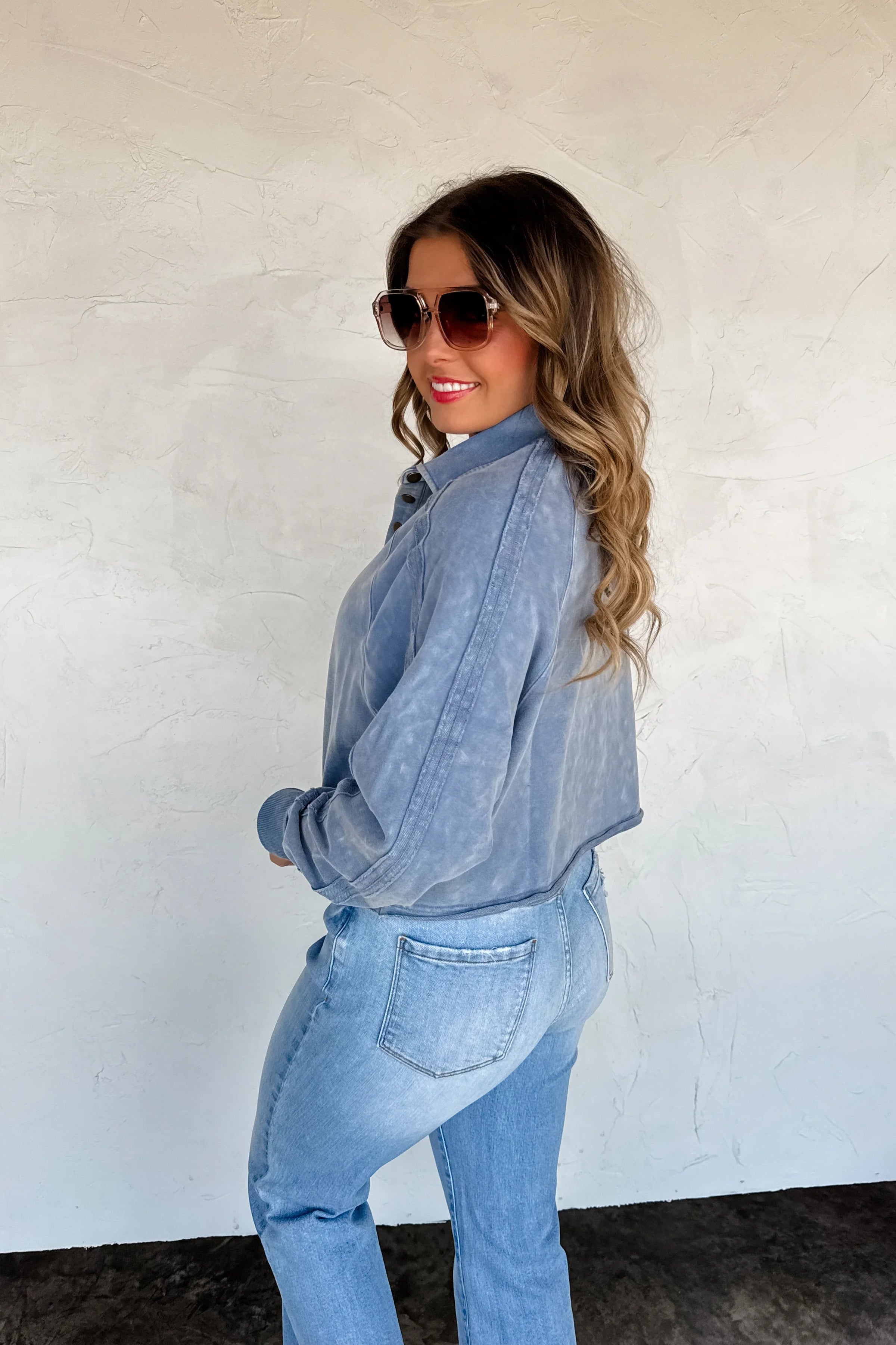 We spared no attention to detail in this raw hem/semi crop pullover! Such a relaxed, trendy look! Has a slouchy fit, vintage wash, exposed seaming and ribbed cuffs. Has super soft terry "sweatshirt" feel on the inside!