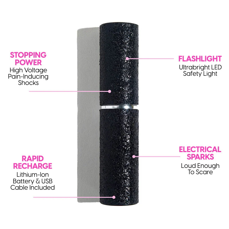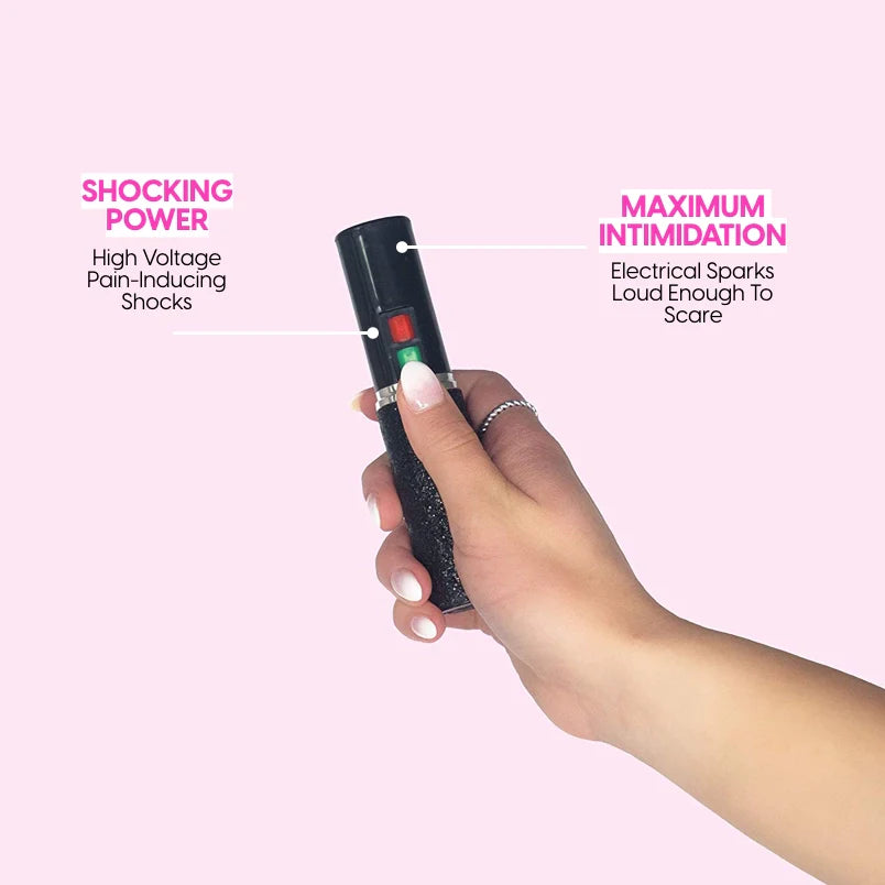 A discreet (and beautiful!) mini stun gun for situations when you need some extra peace of mind. Looks like a cosmetic tube and also has an LED flashlight! Comes in pink or black glitter.