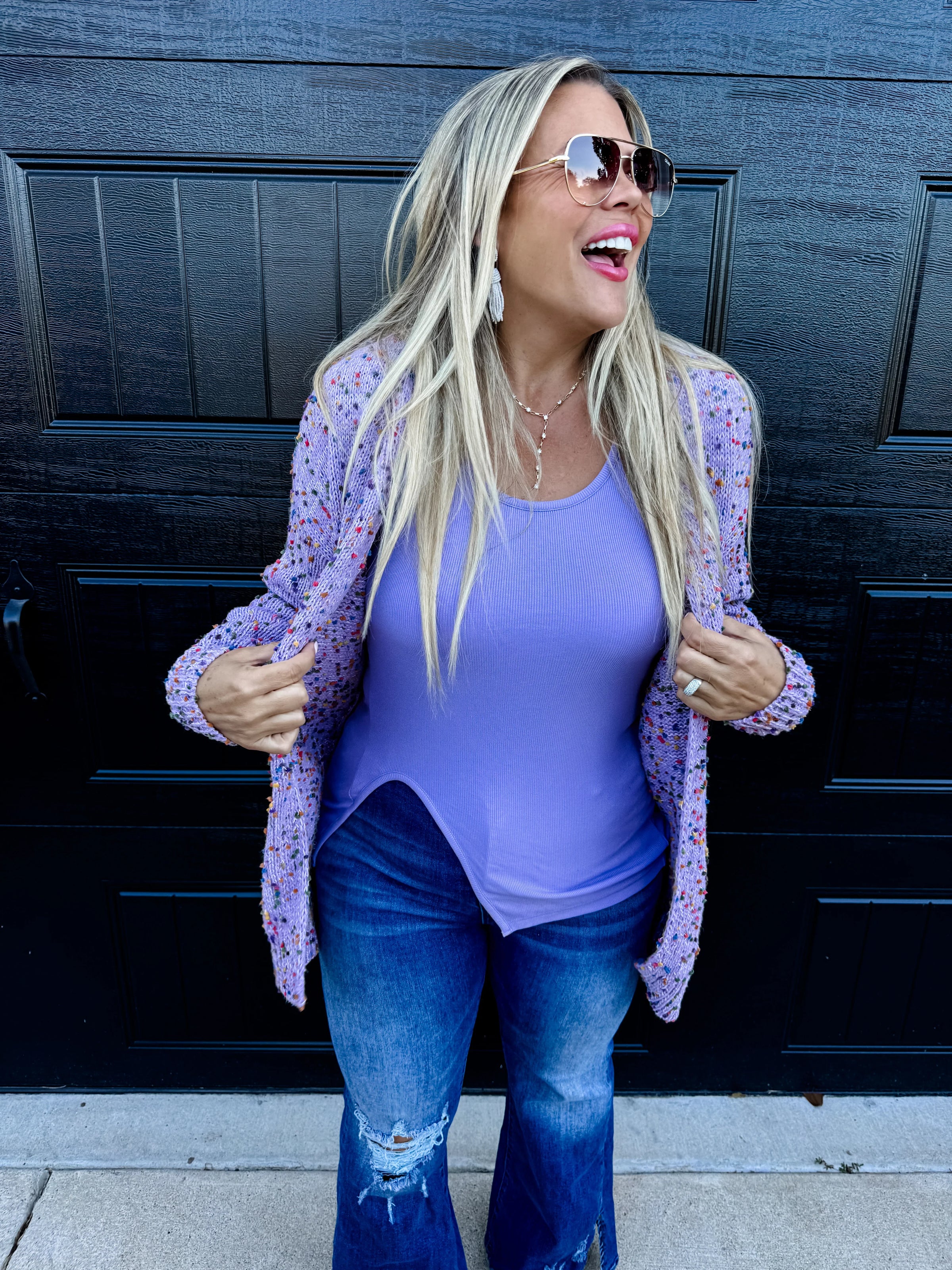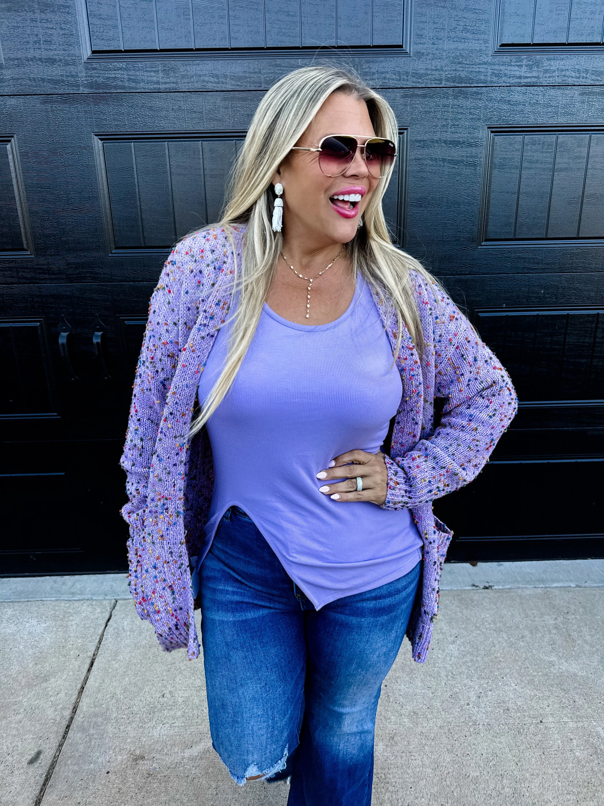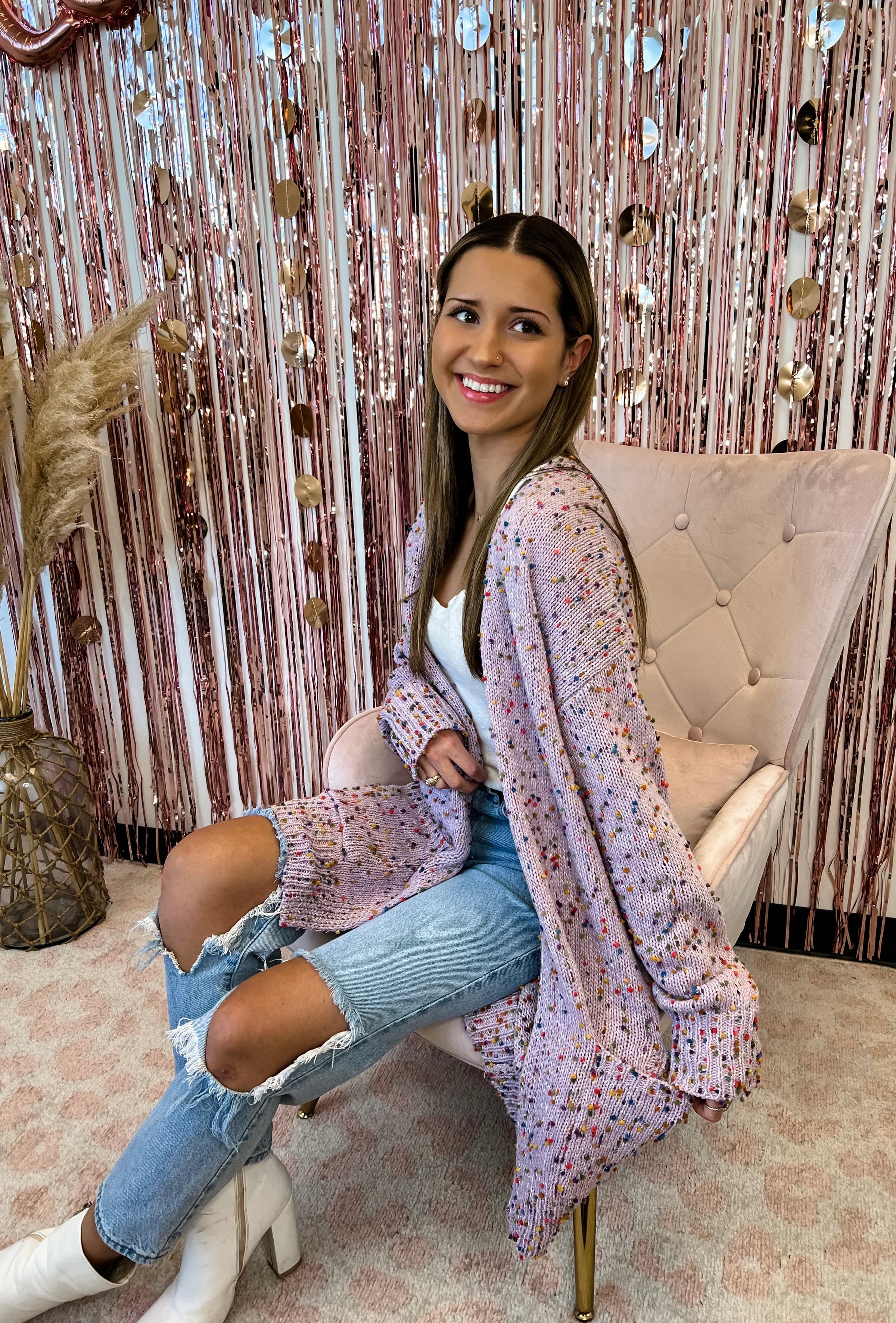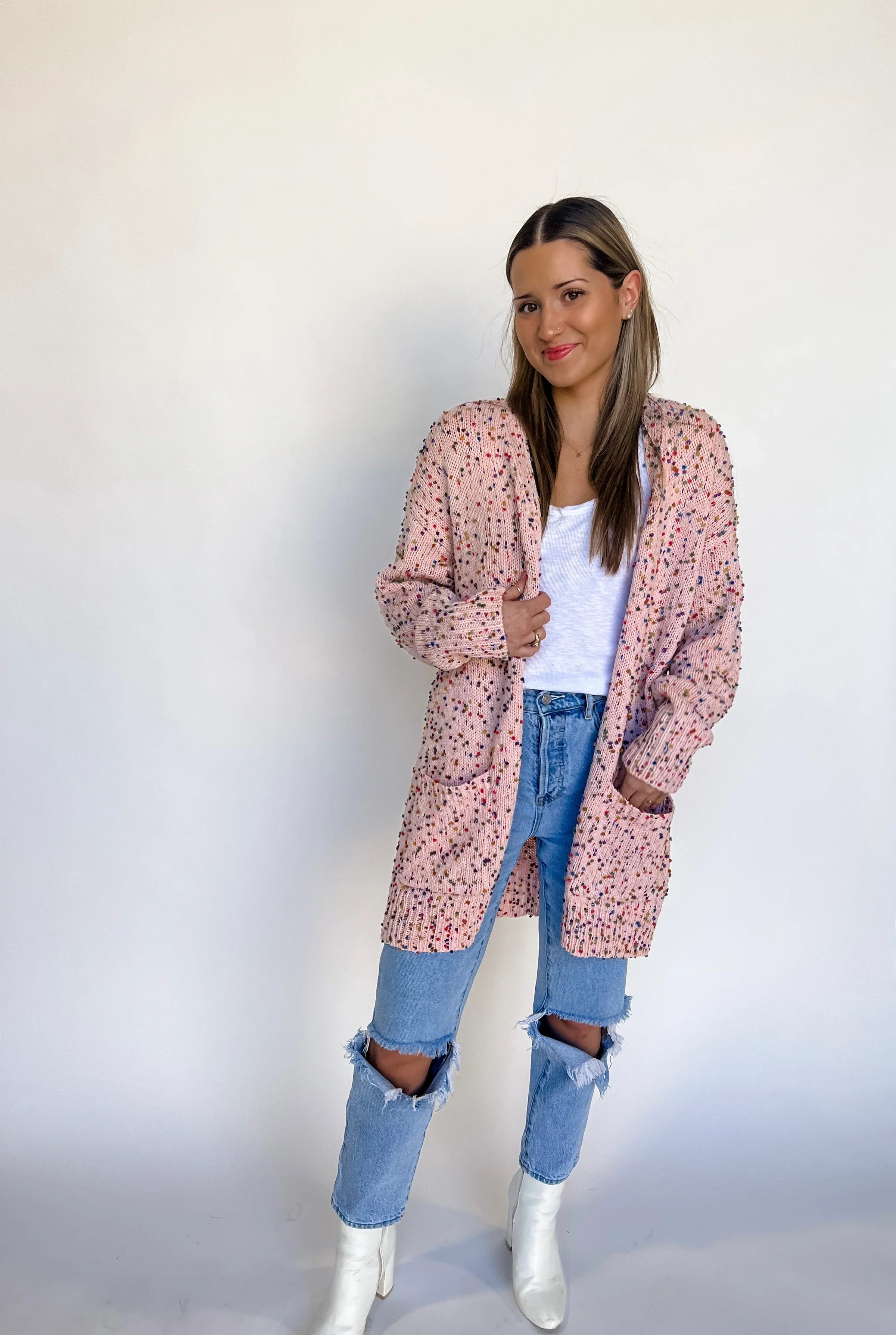 Spring colors are here! This cardigan is everything!! Chunky sweater knit fabric that is cozy and soft! Features size pockets and multi-color "confetti" dots throughout.