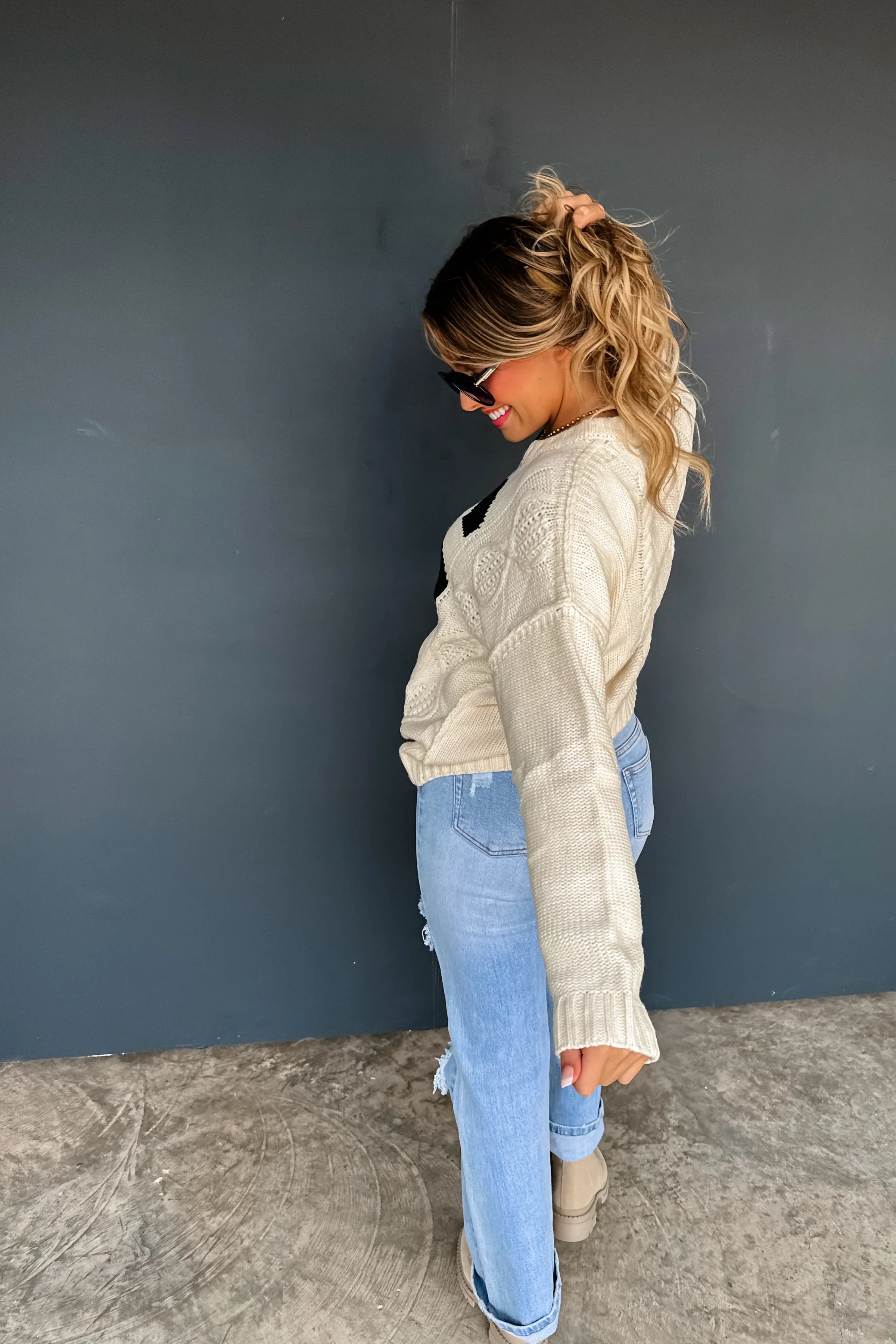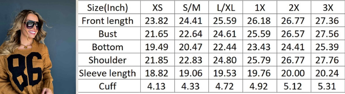 This bold knit sweater is the ultimate statement piece for game day and beyond. Featuring a chunky cable knit design with a large “86” graphic front and center, it brings a sporty, vintage-inspired vibe. The relaxed fit and cozy knit make it an easy throw-on with jeans, cargos, or skirts.