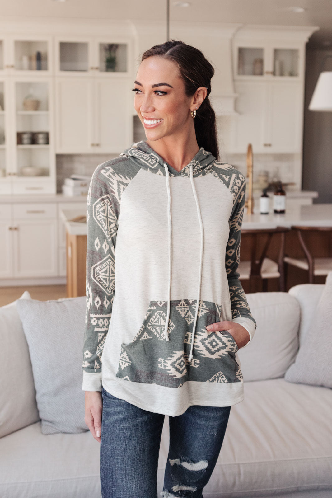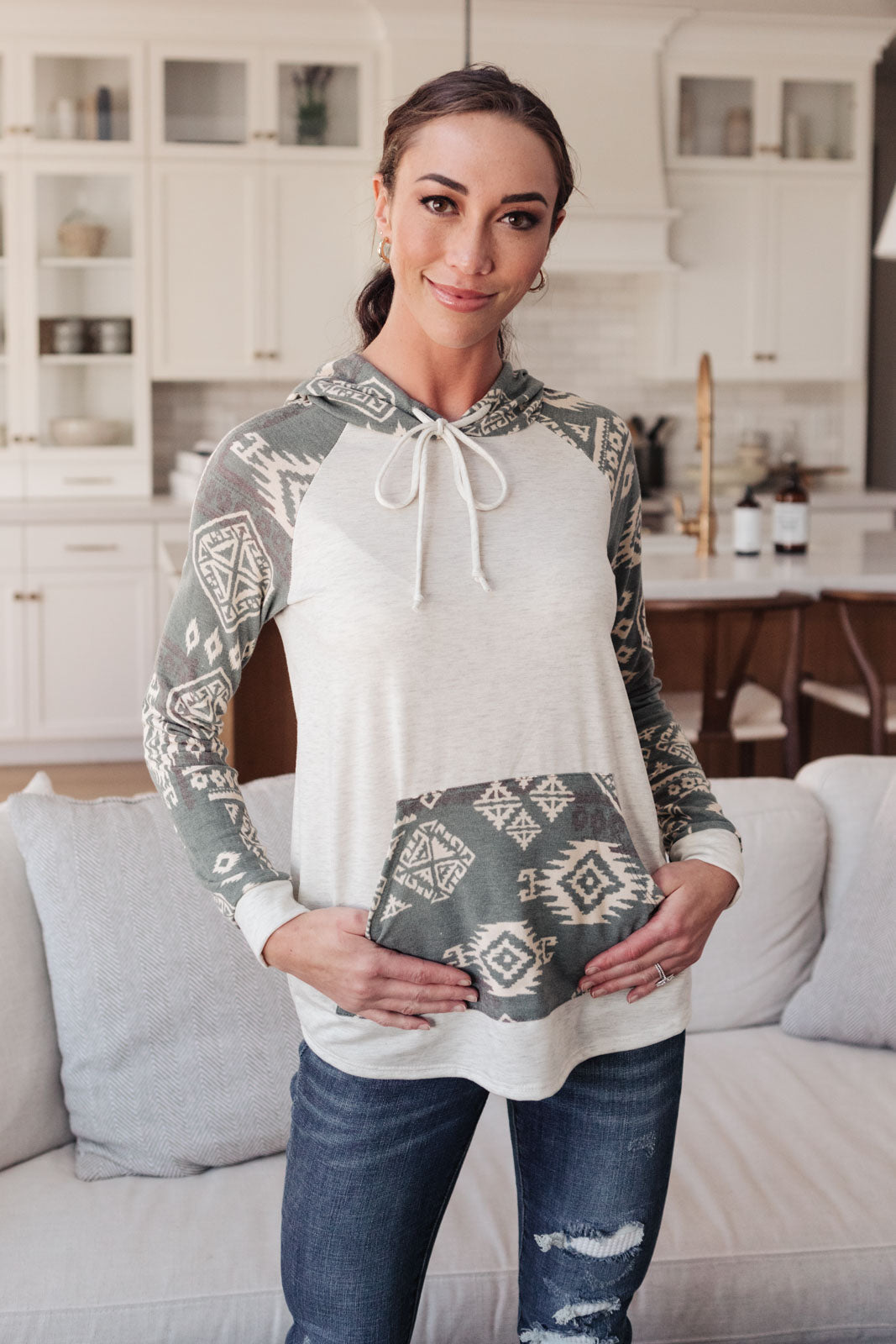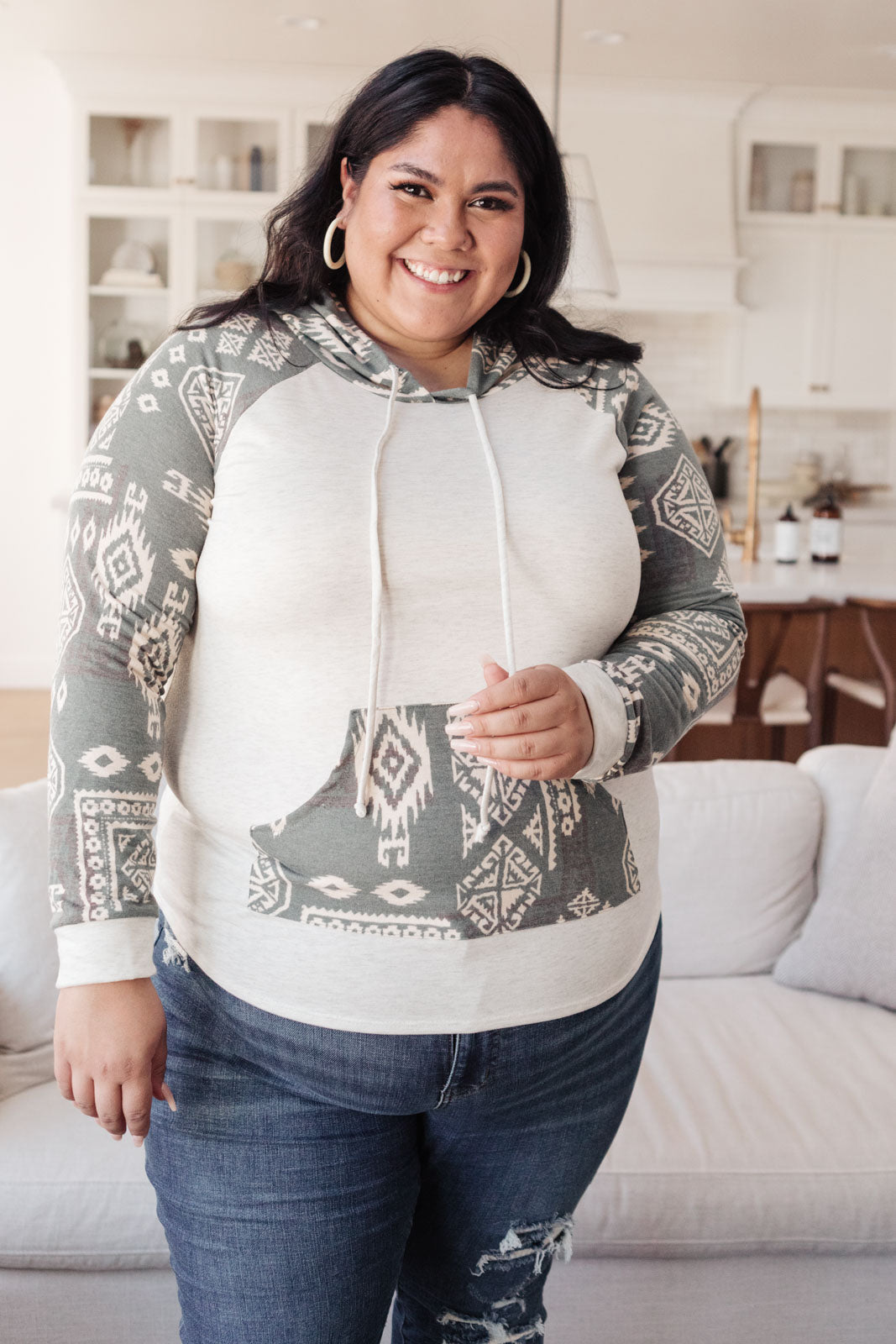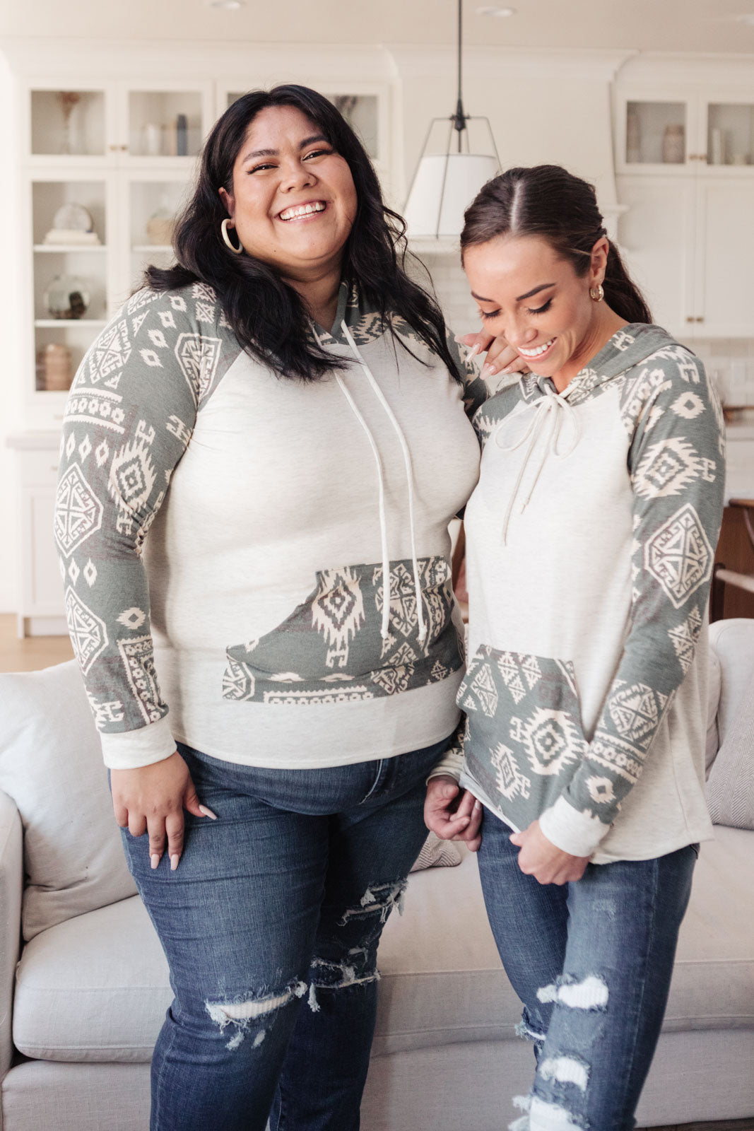 The Ready Set Go Pullover is a lightweight hoodie that features a brilliant muted green, with contrasting aztec print on the hood, sleeves, and pocket of the pullover. This is the perfect layering piece or easy to throw on as you leave the house. You can leave the drawstrings as is or tie them in a bow to elevate your look!