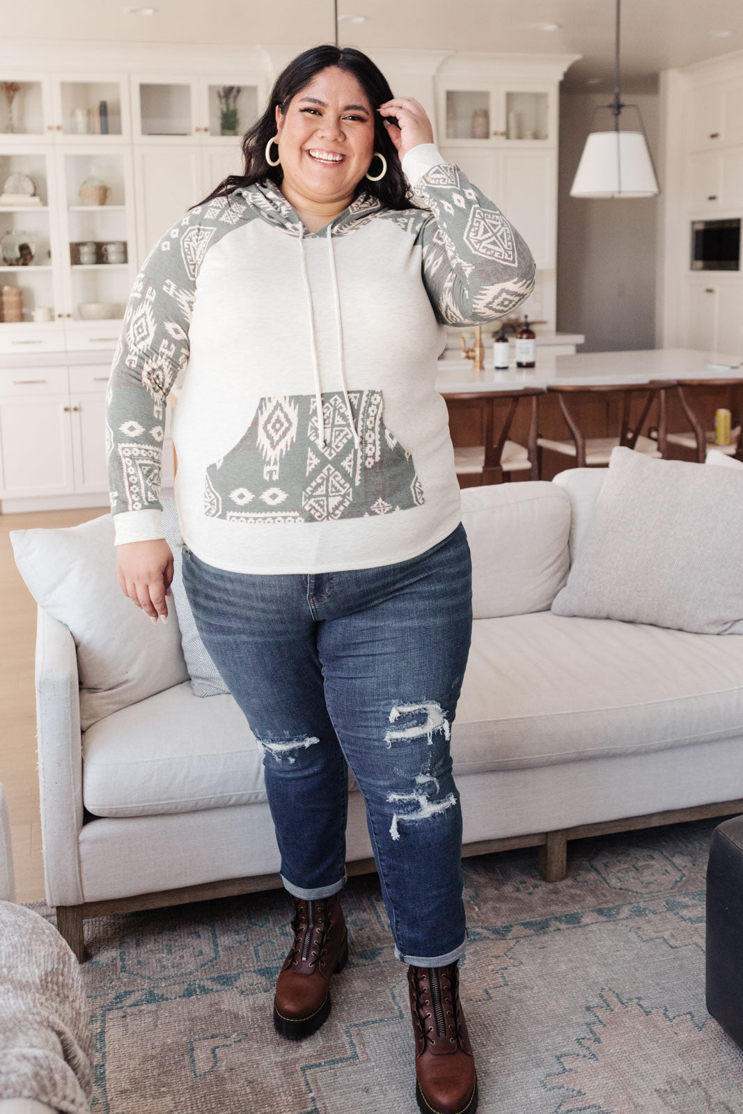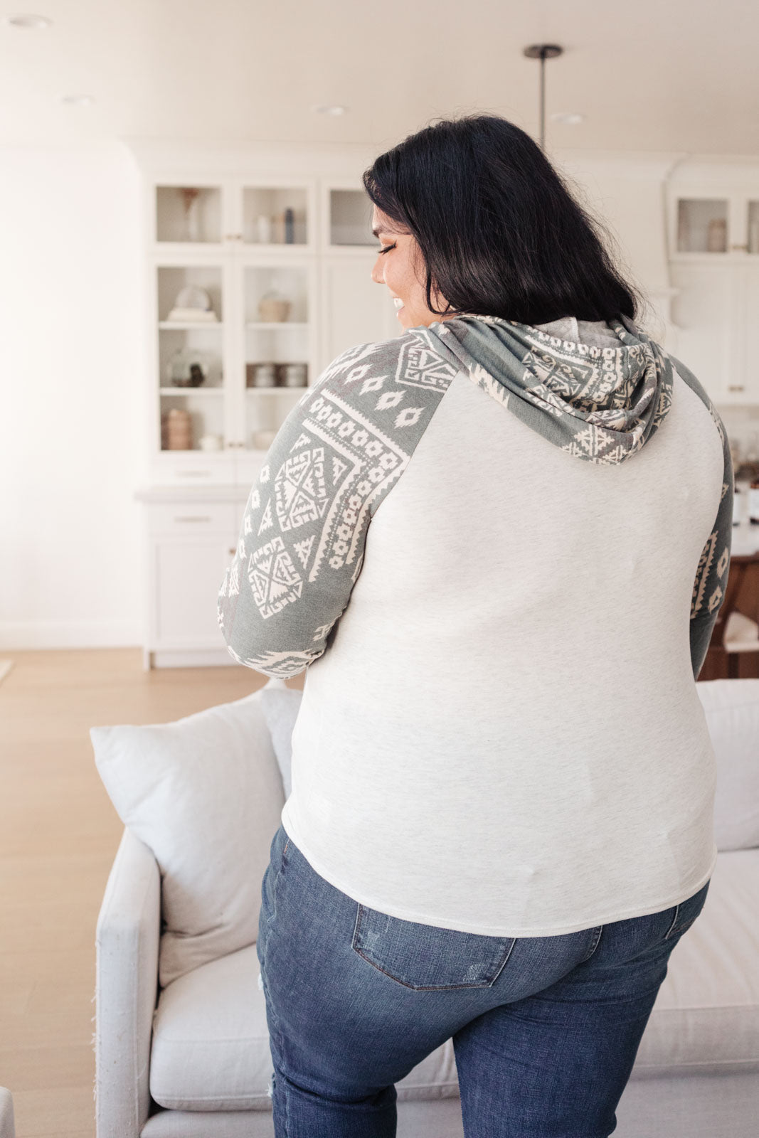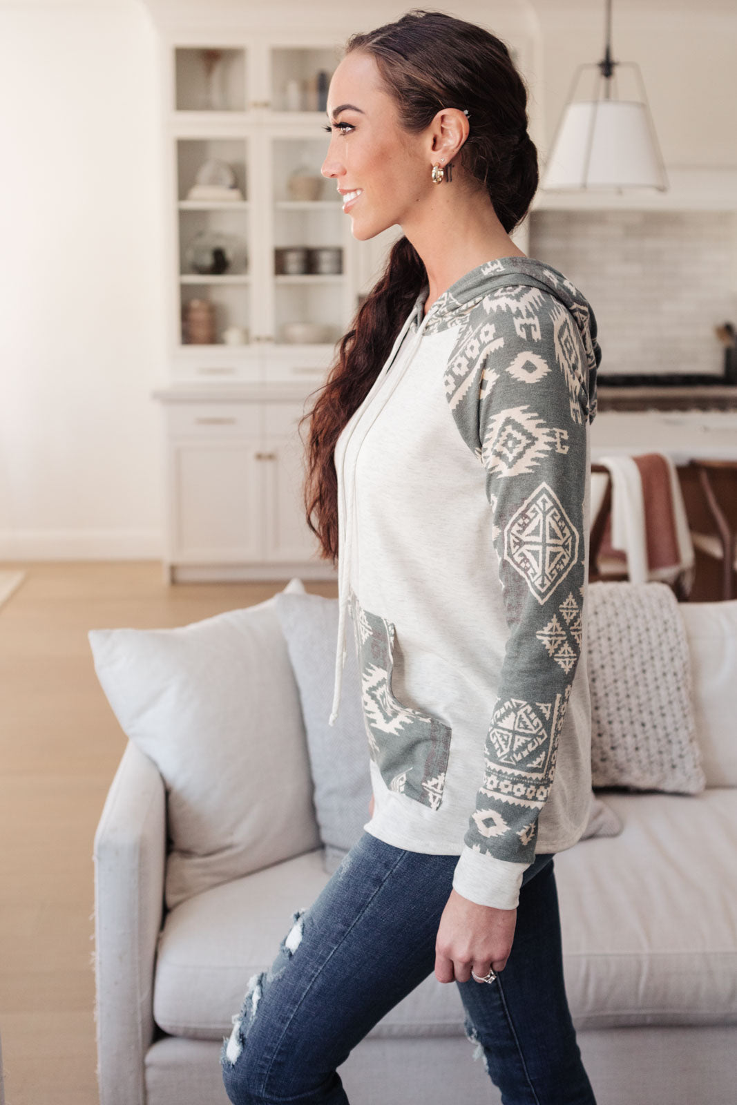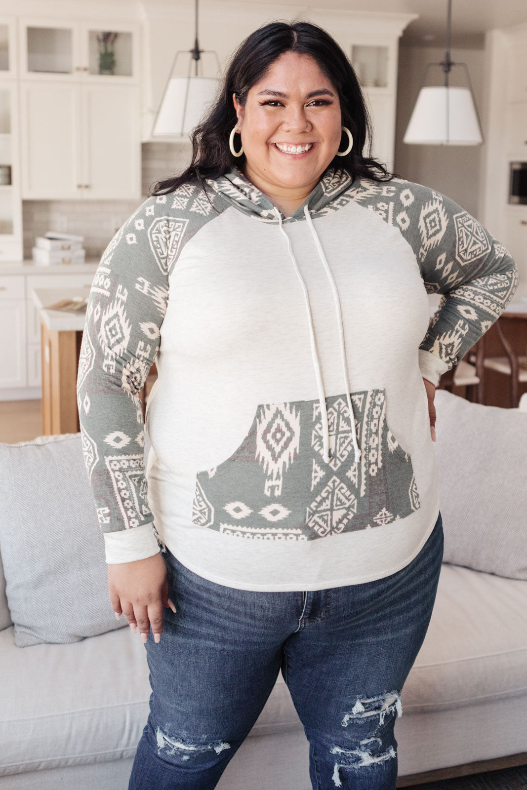 The Ready Set Go Pullover is a lightweight hoodie that features a brilliant muted green, with contrasting aztec print on the hood, sleeves, and pocket of the pullover. This is the perfect layering piece or easy to throw on as you leave the house. You can leave the drawstrings as is or tie them in a bow to elevate your look!