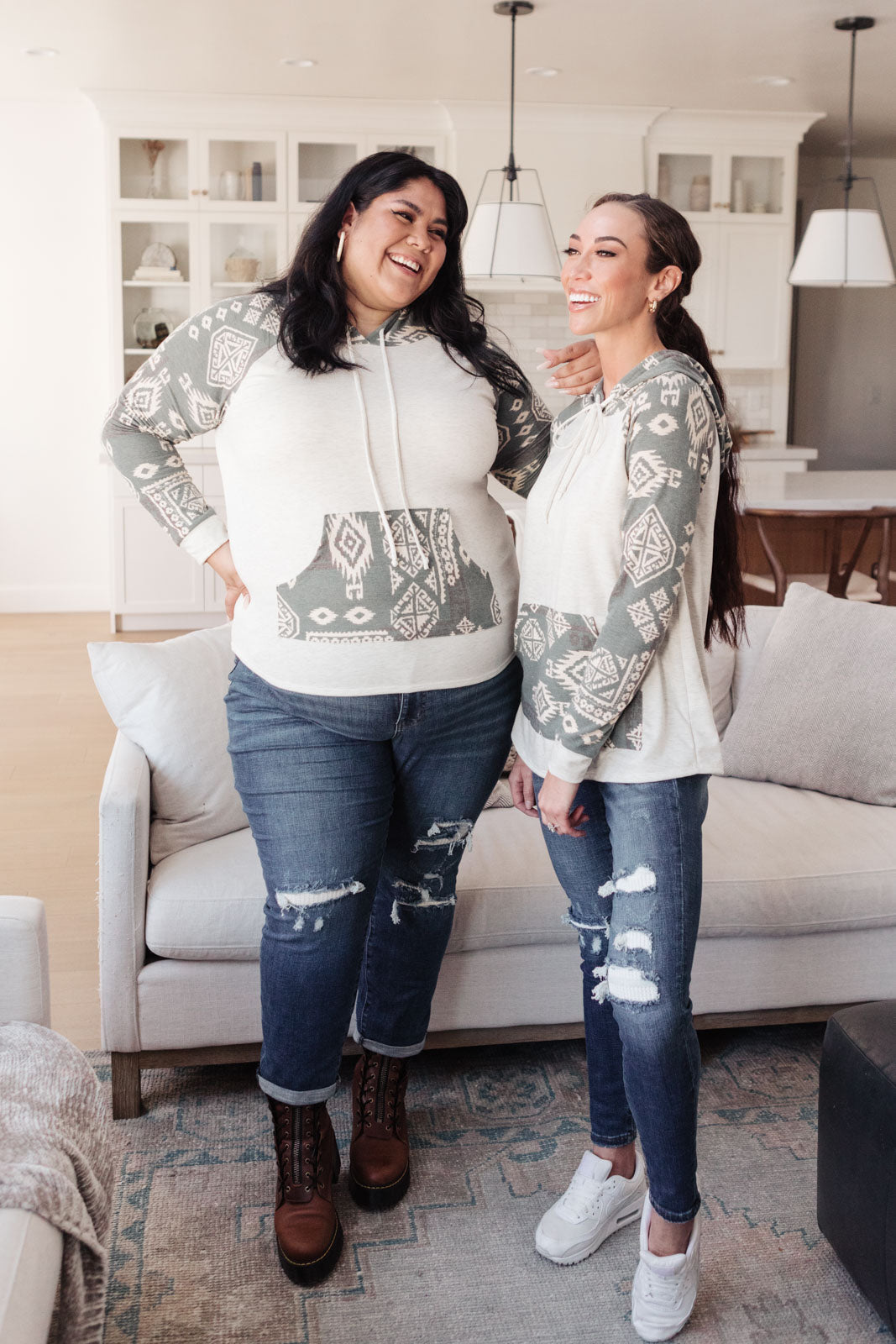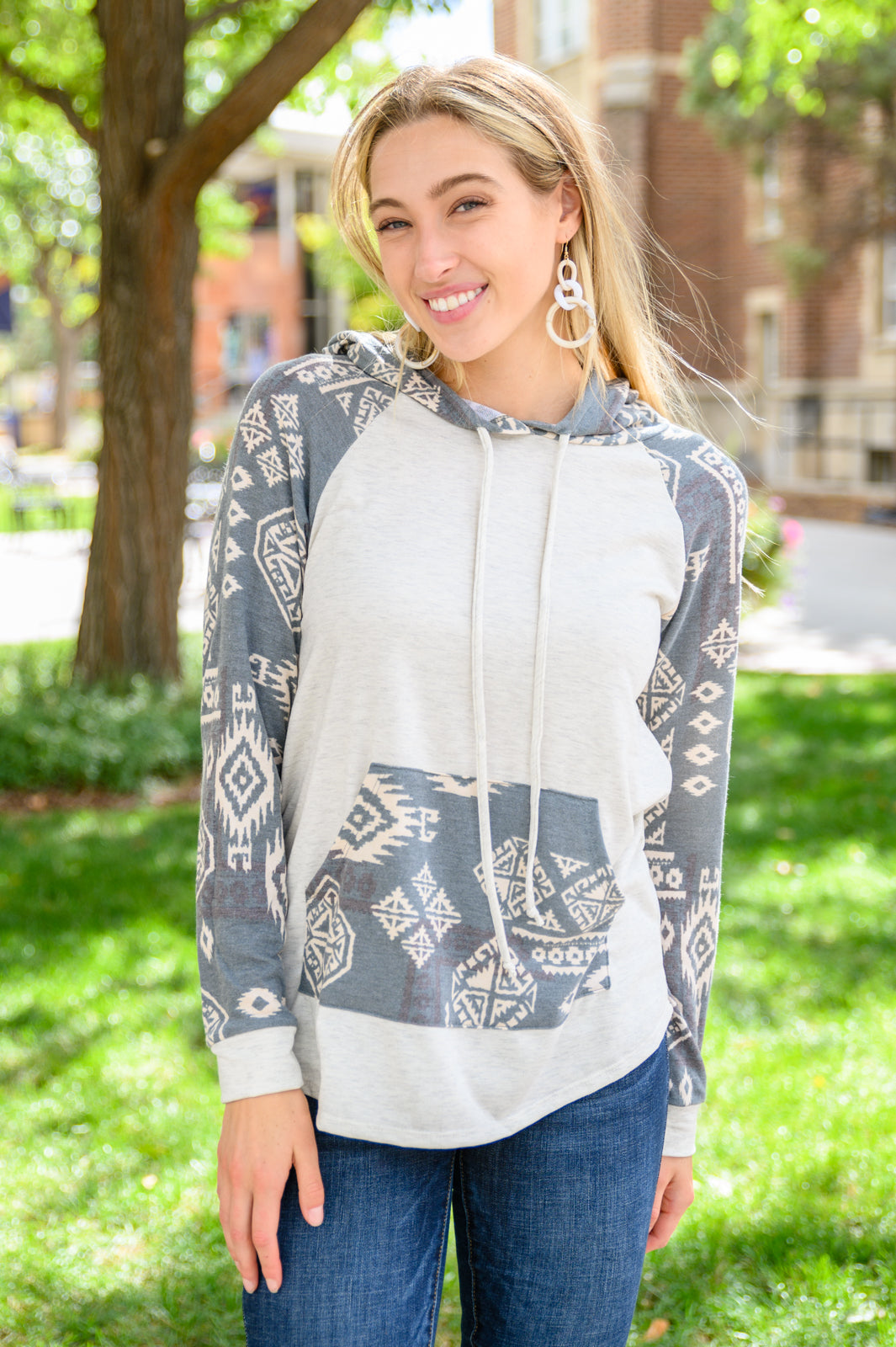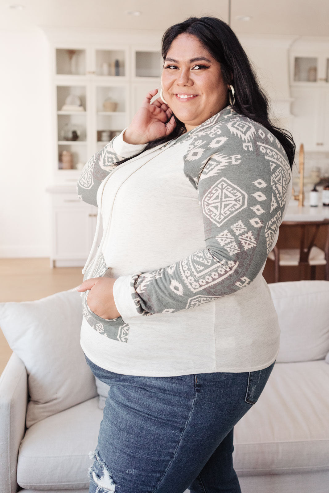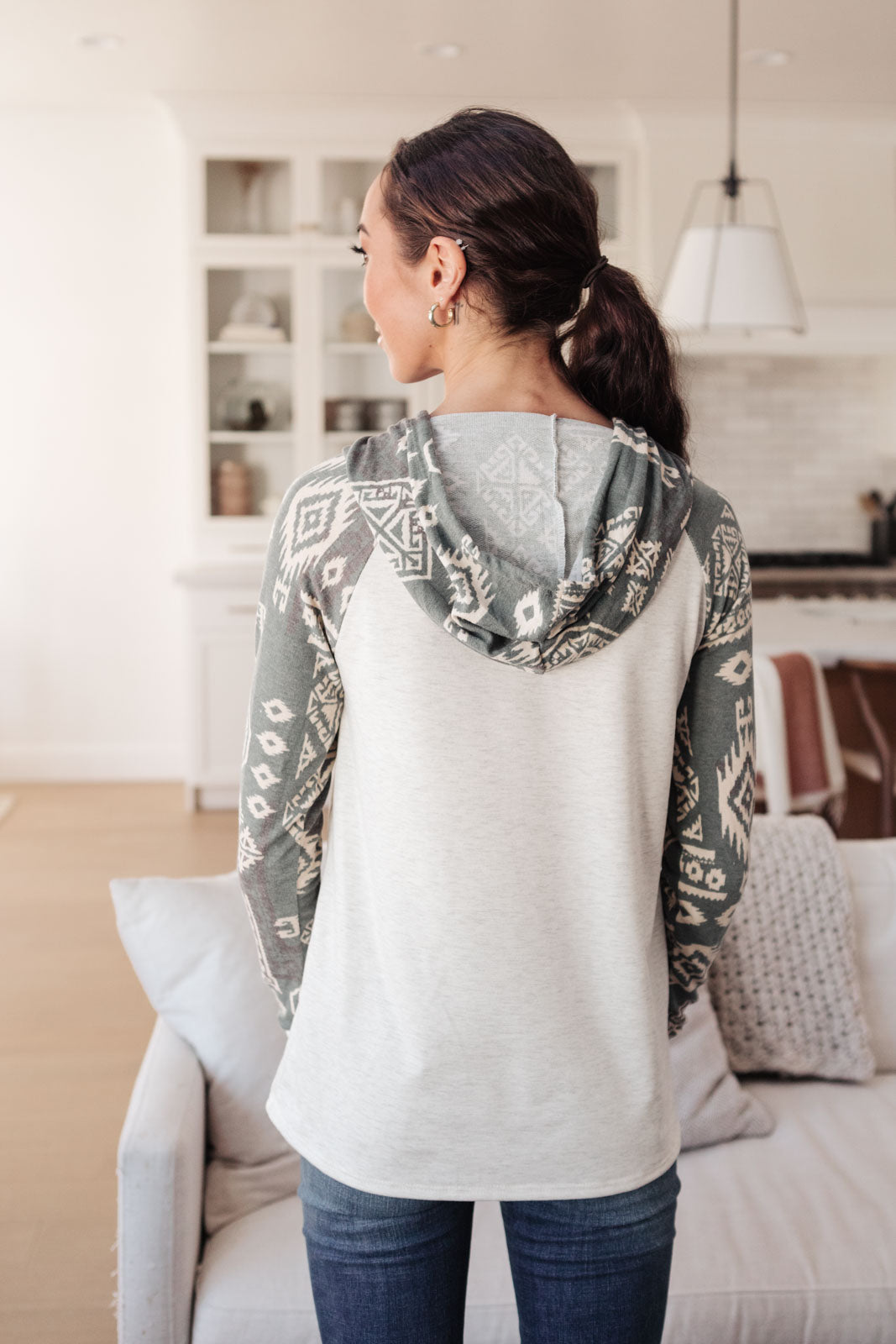 The Ready Set Go Pullover is a lightweight hoodie that features a brilliant muted green, with contrasting aztec print on the hood, sleeves, and pocket of the pullover. This is the perfect layering piece or easy to throw on as you leave the house. You can leave the drawstrings as is or tie them in a bow to elevate your look!