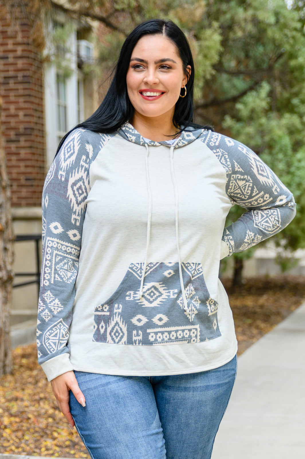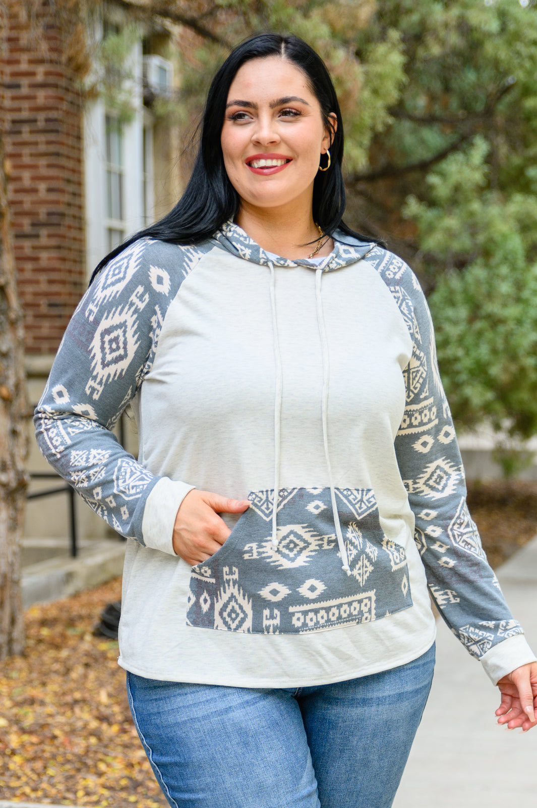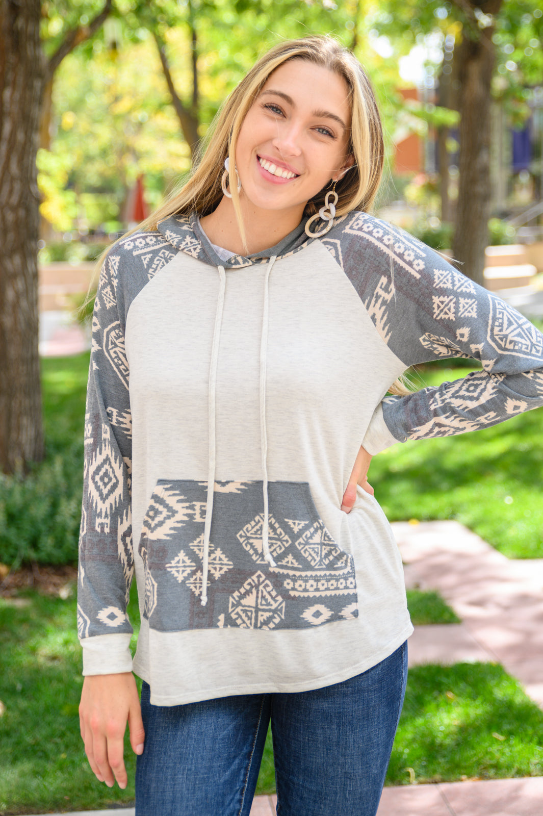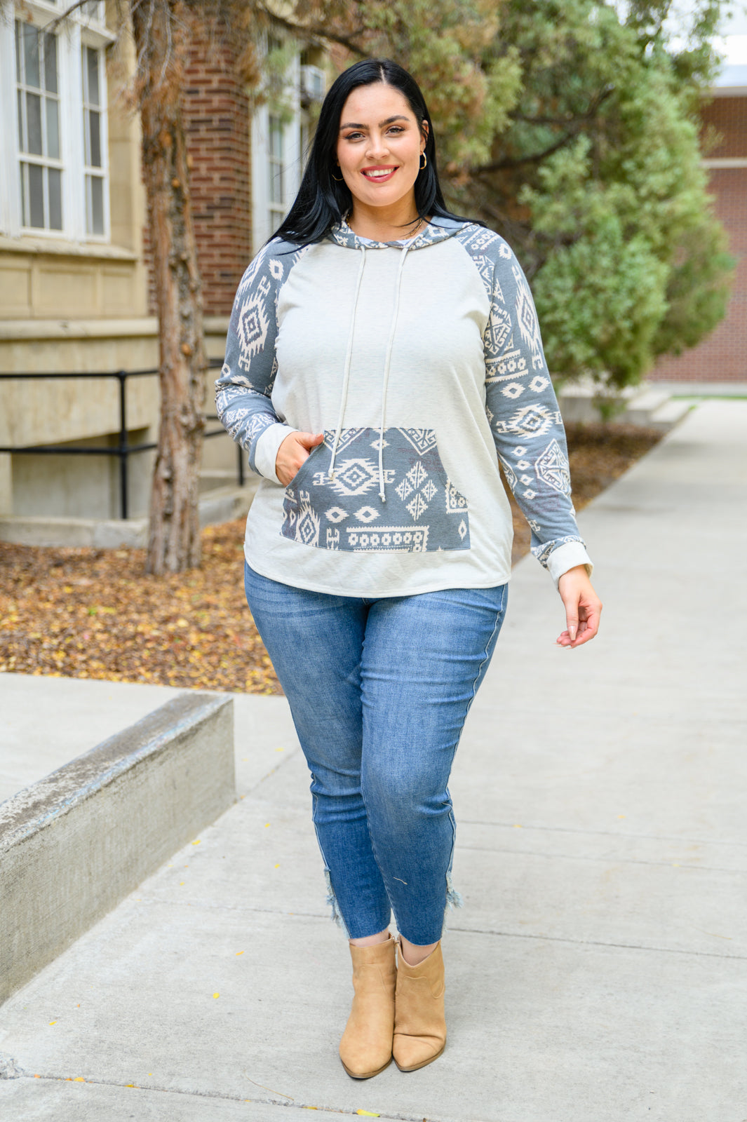The Ready Set Go Pullover is a lightweight hoodie that features a brilliant muted green, with contrasting aztec print on the hood, sleeves, and pocket of the pullover. This is the perfect layering piece or easy to throw on as you leave the house. You can leave the drawstrings as is or tie them in a bow to elevate your look!