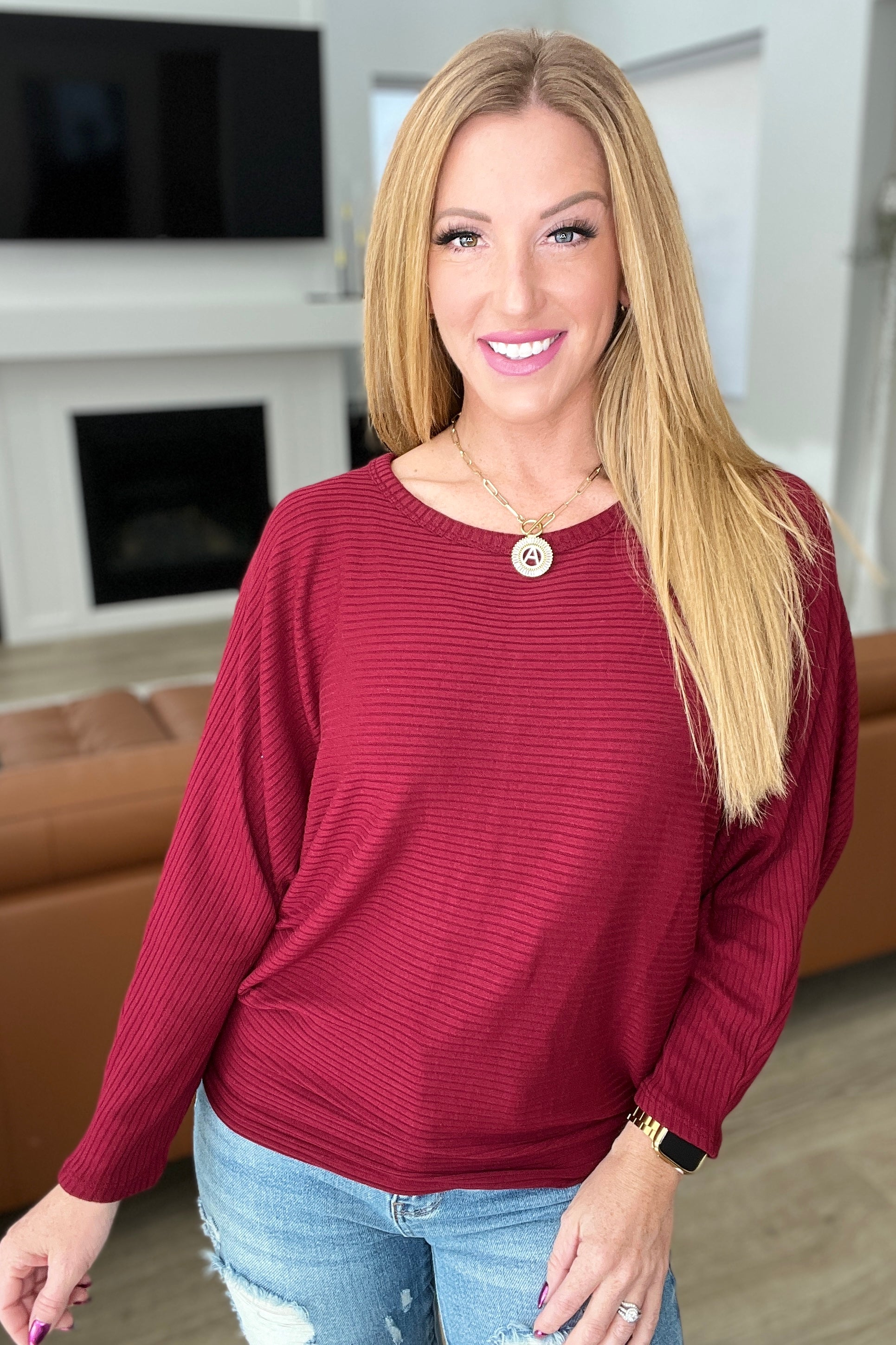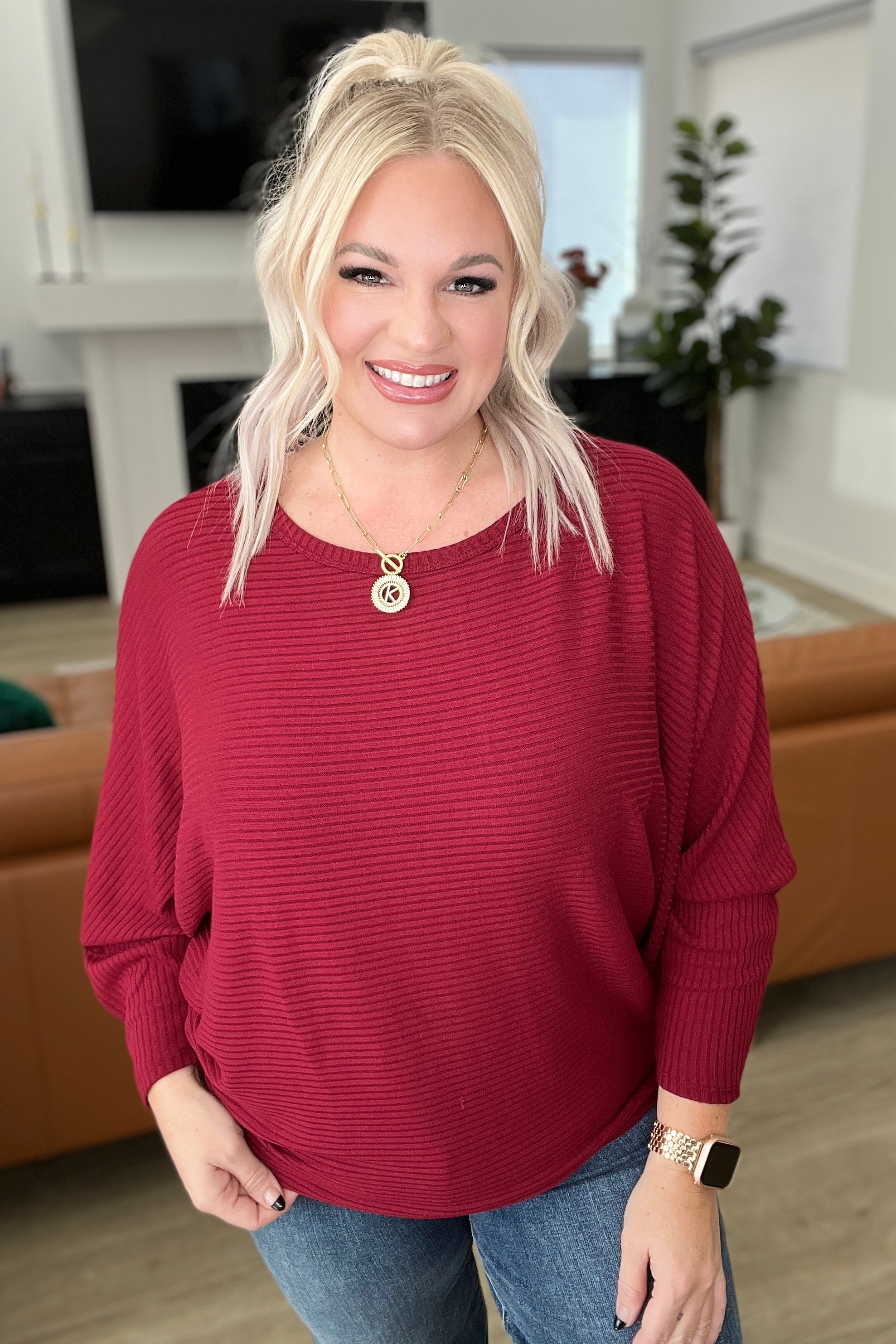 Ribbed Batwing Boat Neck Top in Dark Burgundy