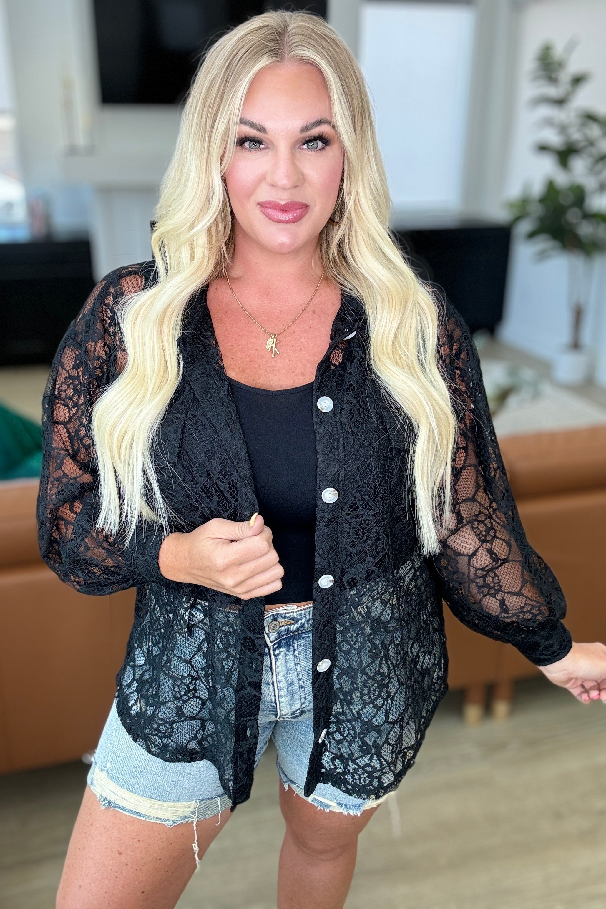 Unite style and functionality with our Stick Together Lace Button Up in Black. The delicate lace adds a touch of femininity, while the collared neckline and front button closure give a polished look. The button closure cuffs and faux chest patch pockets keep your possessions secure.