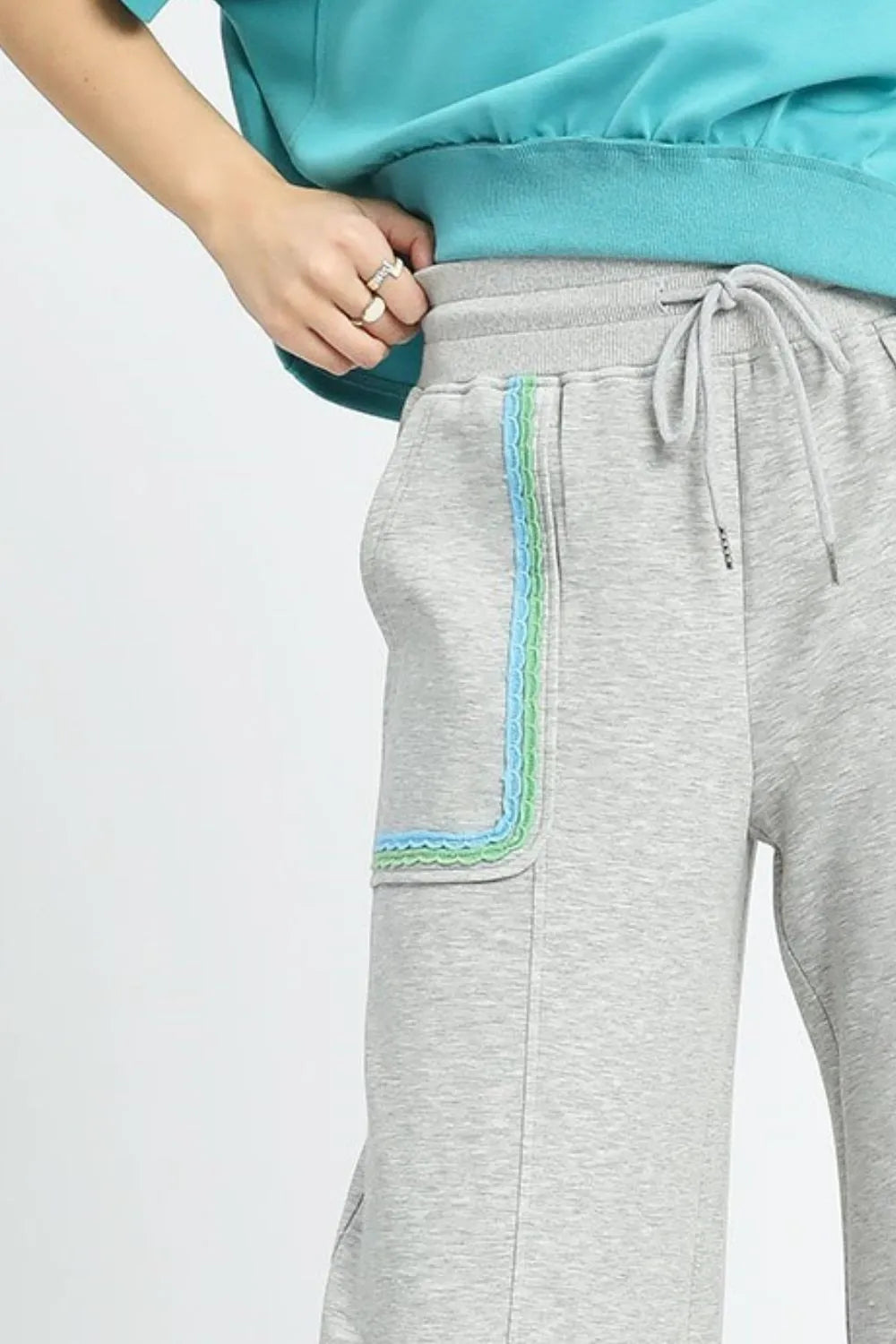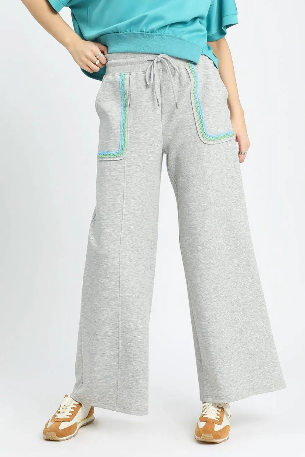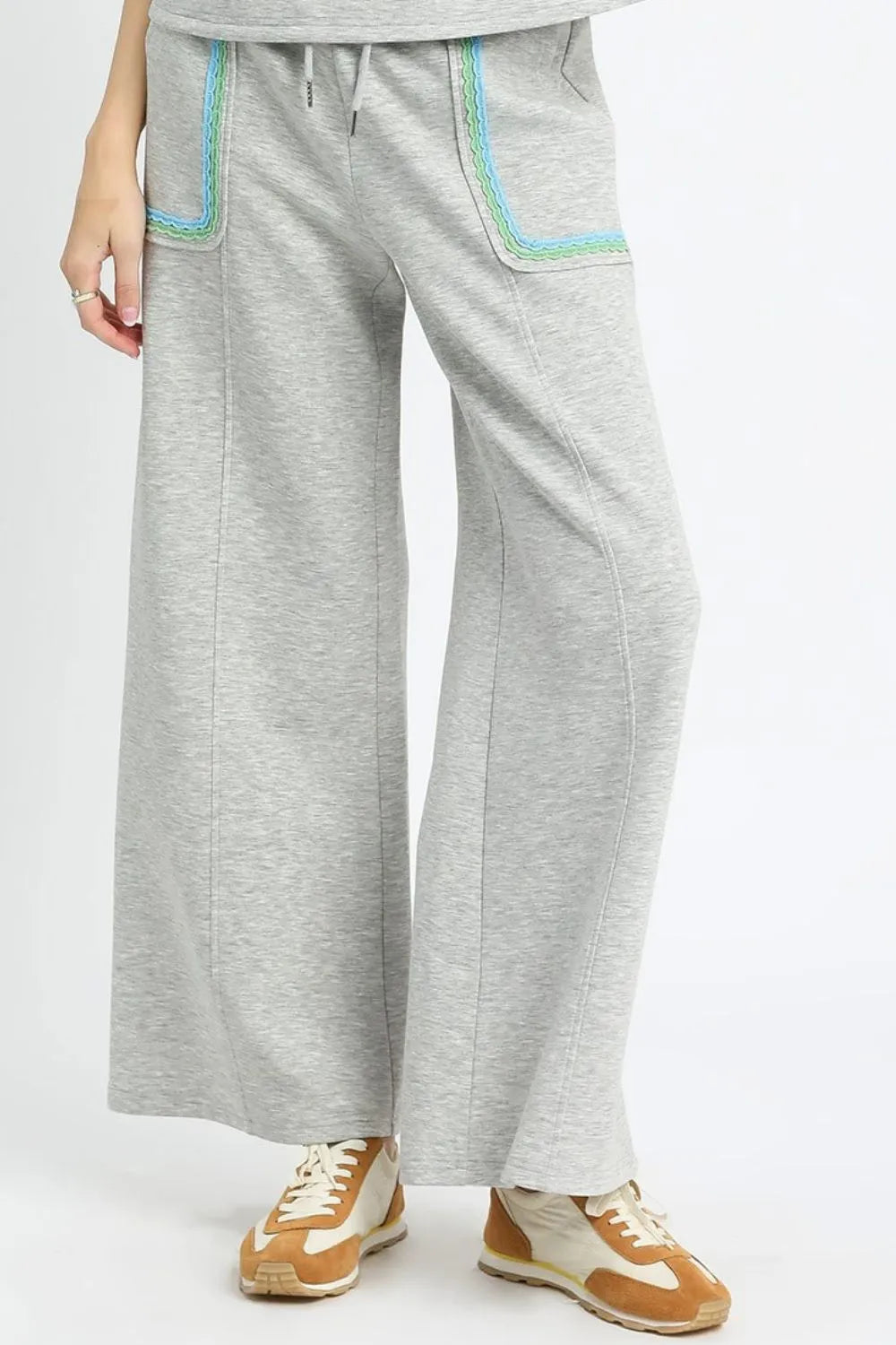 These stylish wide leg sweatpants feature a comfortable grey heather knit fabric with eye-catching turquoise contrast trim along the pockets. The relaxed fit design includes a drawstring waistband for adjustable comfort, functional front patch pockets with decorative trim, and a fashion wide leg silhouette that offers both comfort and contemporary style. Perfect for casual wear, these pants blend athletic comfort with fashion-forward design, made from soft cotton blend material ideal for all-day wear.