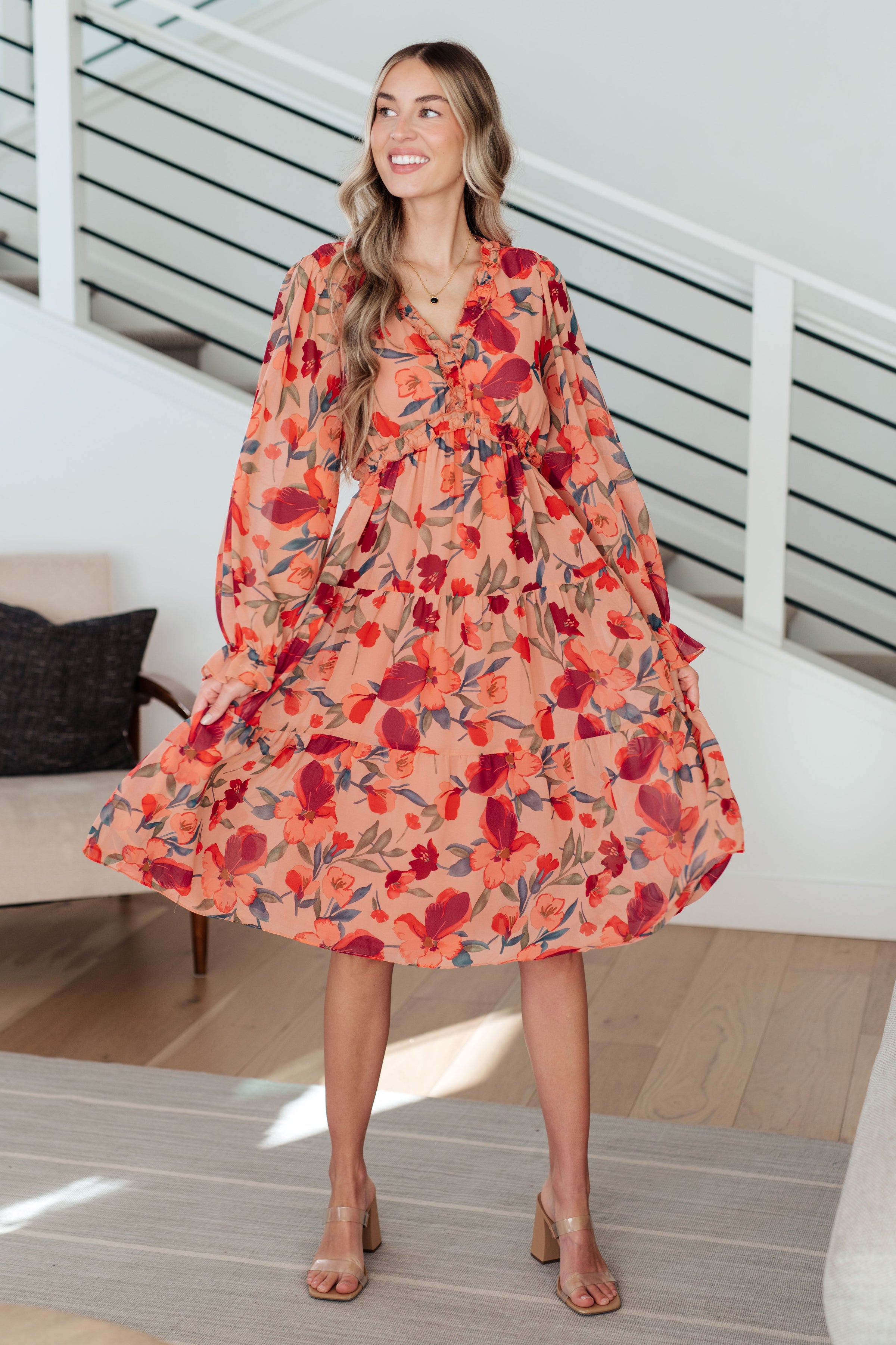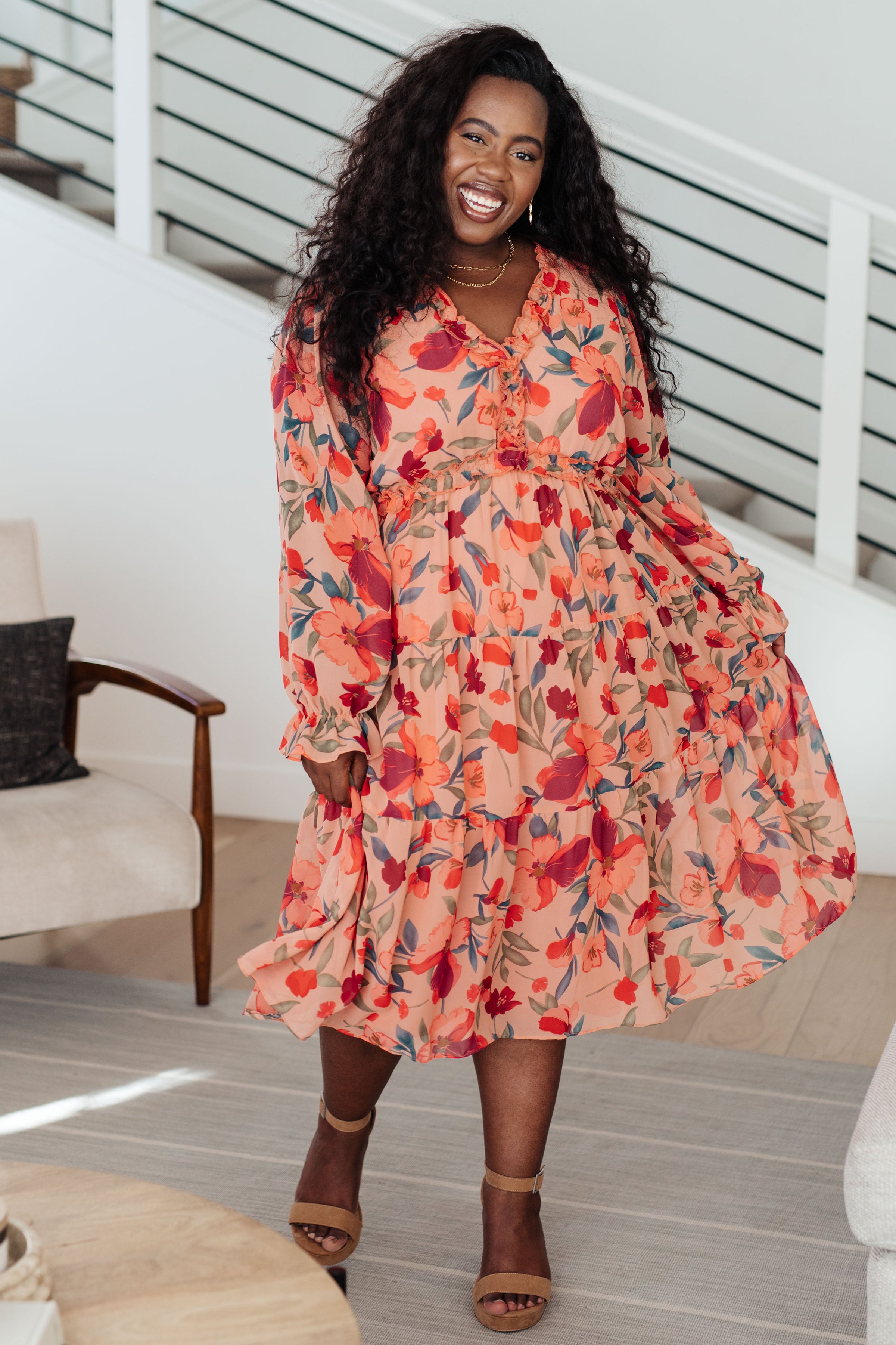 Look oh-so-chic in the You And Me Floral Dress! Featuring a flattering ruffled v-neckline, long sleeves, and a gorgeous floral print chiffon, this dress will make you feel beautiful in every way. The tiered skirt and midi-length silhouette create an ultra-flattering look to complement any occasion.