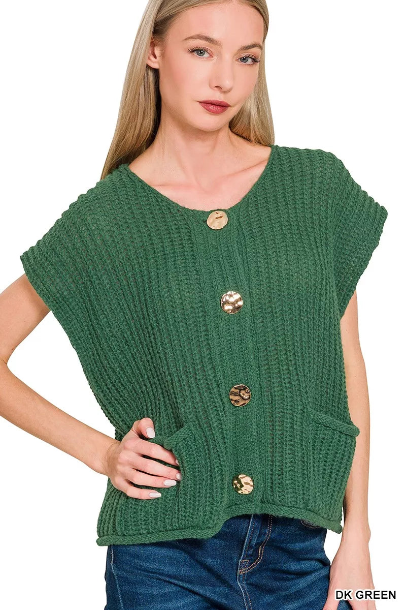 This stylish ivory sweater vest features a chunky knit construction with a comfortable oversized fit. The sleeveless design makes it perfect for layering over shirts or under jackets. Crafted from soft knitted fabric, it offers both warmth and breathability. The button-front closure adds a classic touch while the two front patch pockets provide practical functionality. The relaxed silhouette and V-neckline create a flattering look that works for casual outings or office wear. The neutral ivory color ensures easy pairing with various wardrobe pieces, making it a versatile addition to any closet.